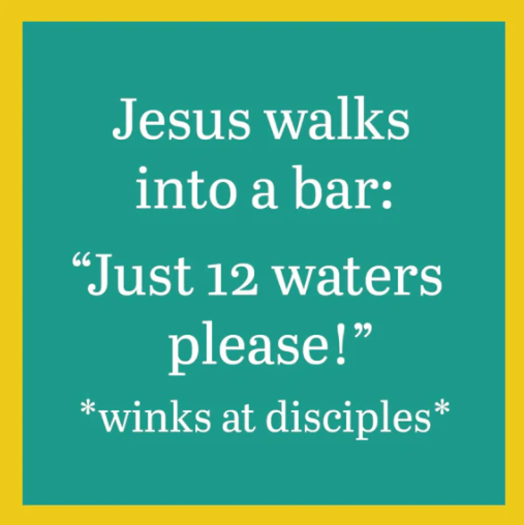 “Jesus walks into a bar: “Just 12 waters please!” *winks at disciples* “