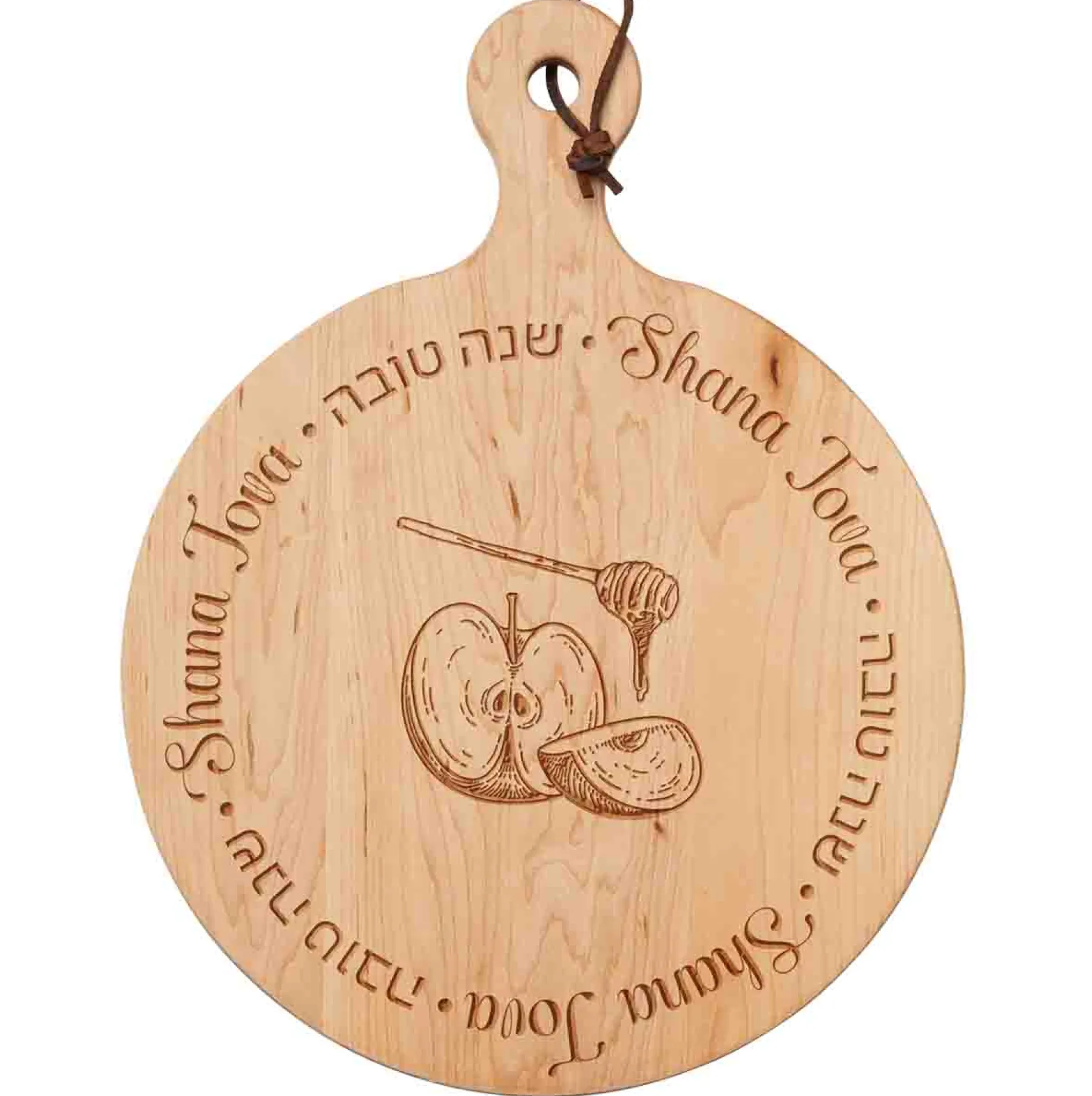 Celebrate Rosh Hashanah with sophistication using Sophistiplate’s 16×12″ Maple Round Board, elegantly adorned with Shana Tova on the border & Apples and Honey in the center.