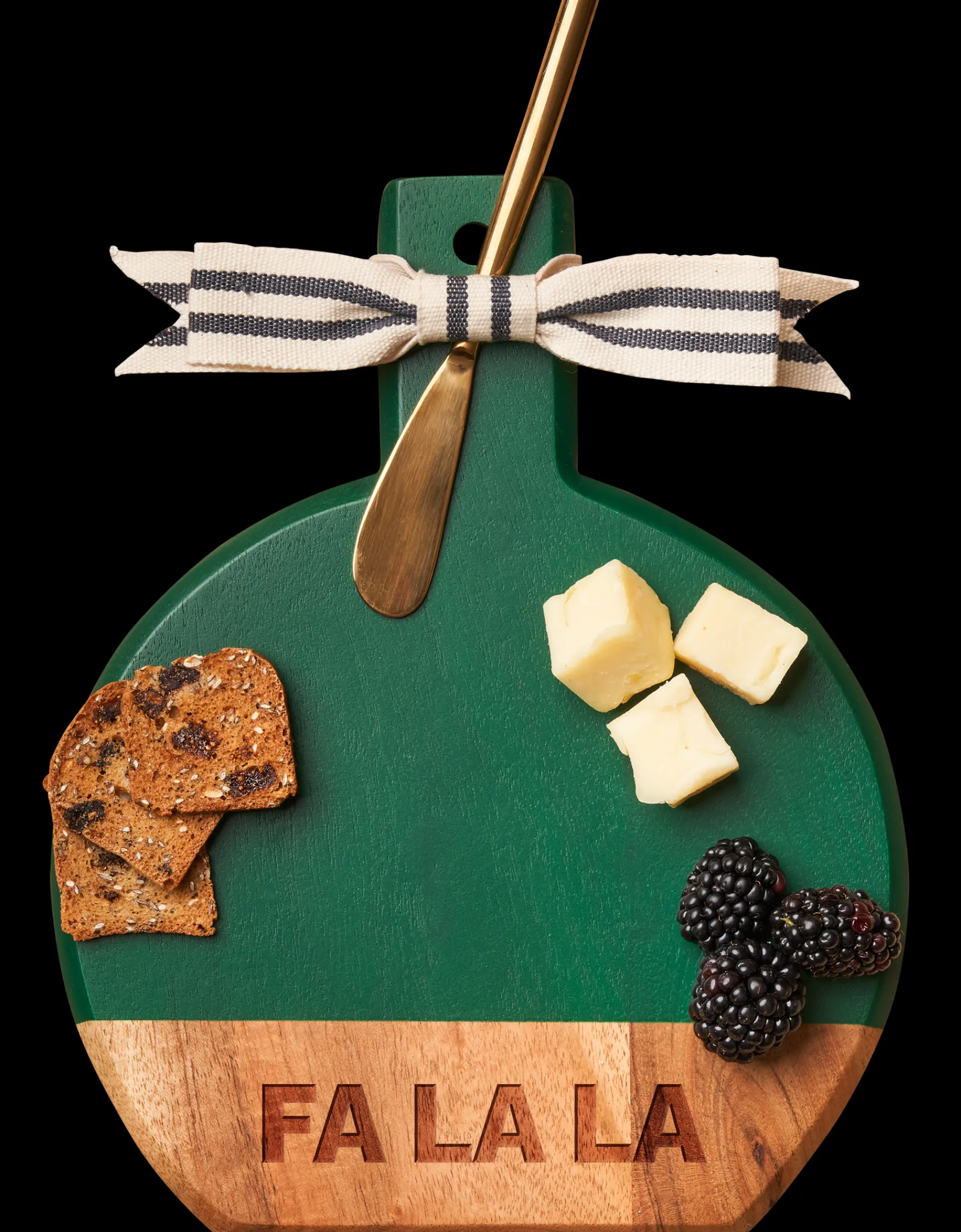 Crafted from premium acacia wood in a sophisticated green color, this gorgeous charcuterie/cheese board features a beveled edge and handle that can be used as an impressive serving board.