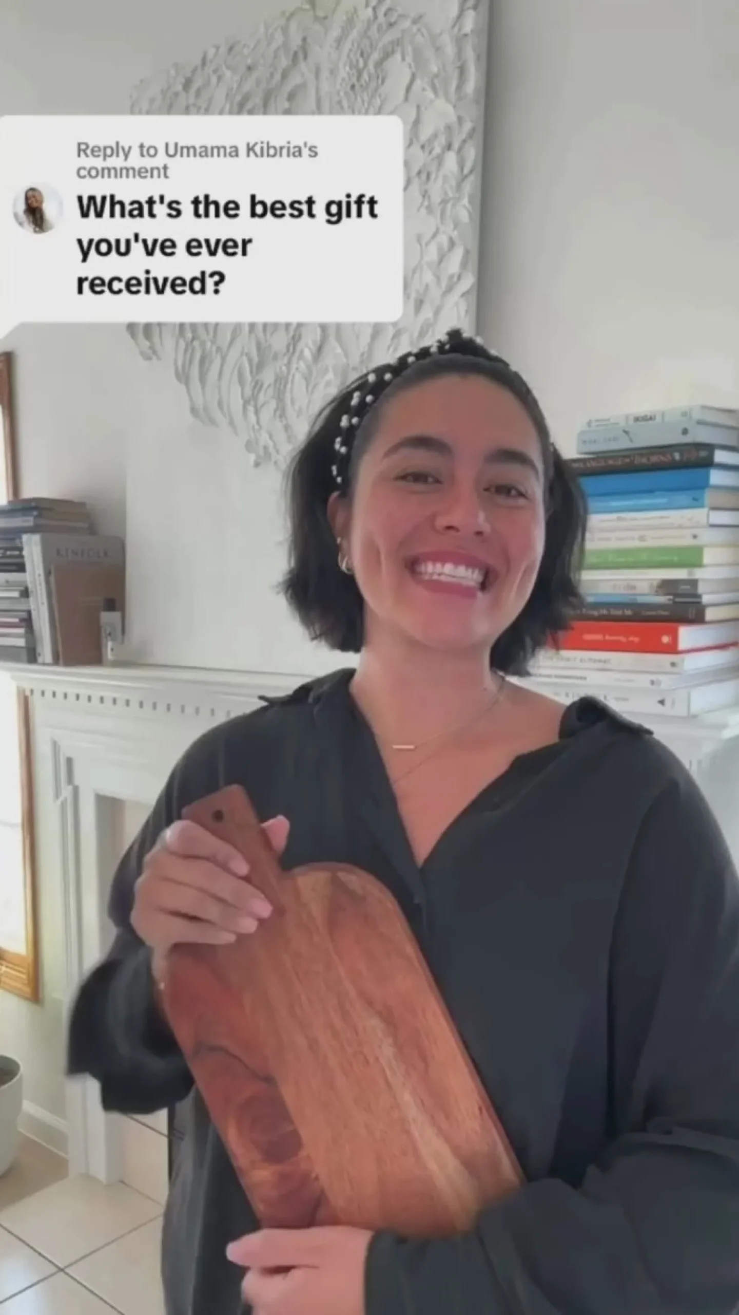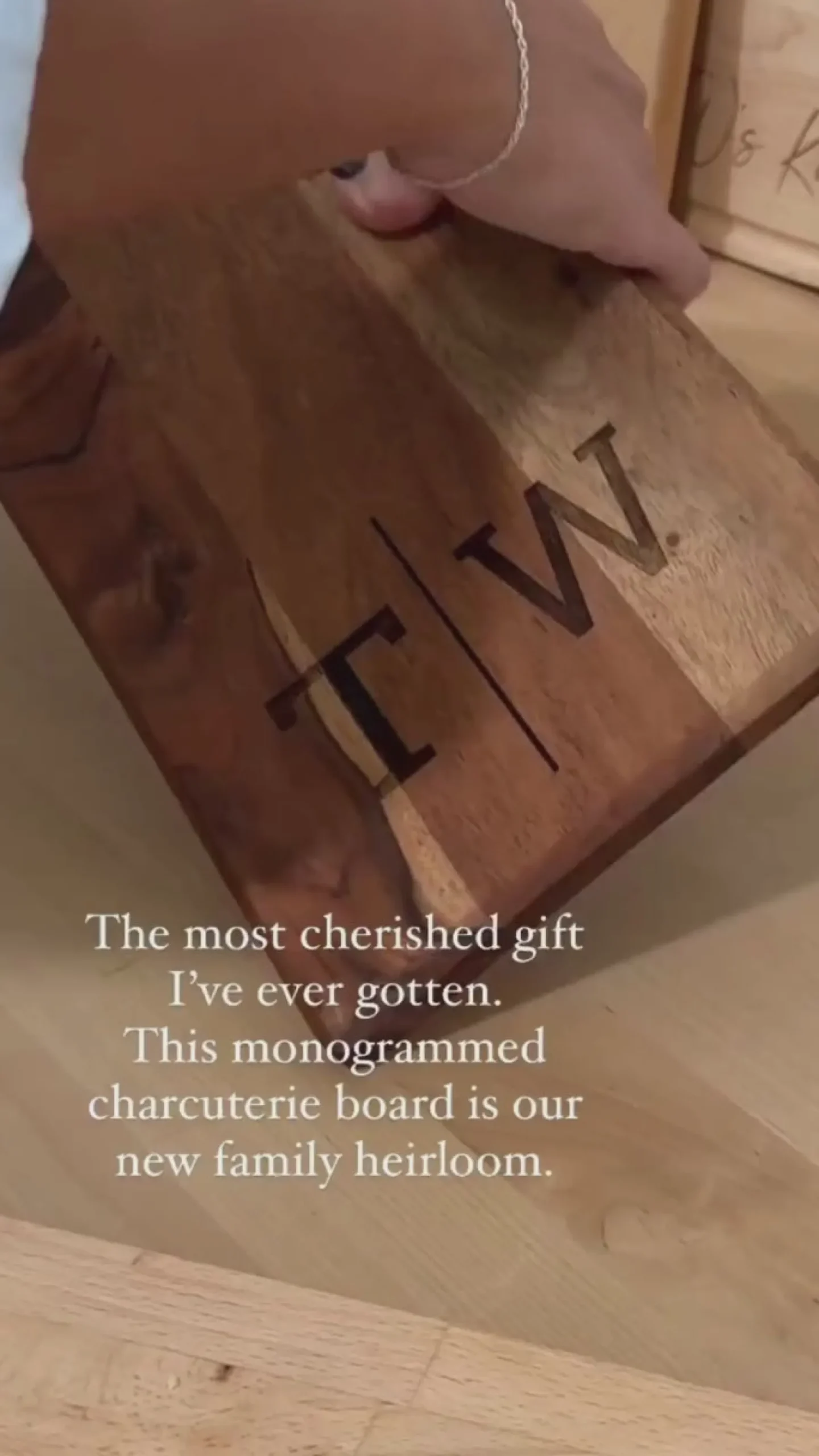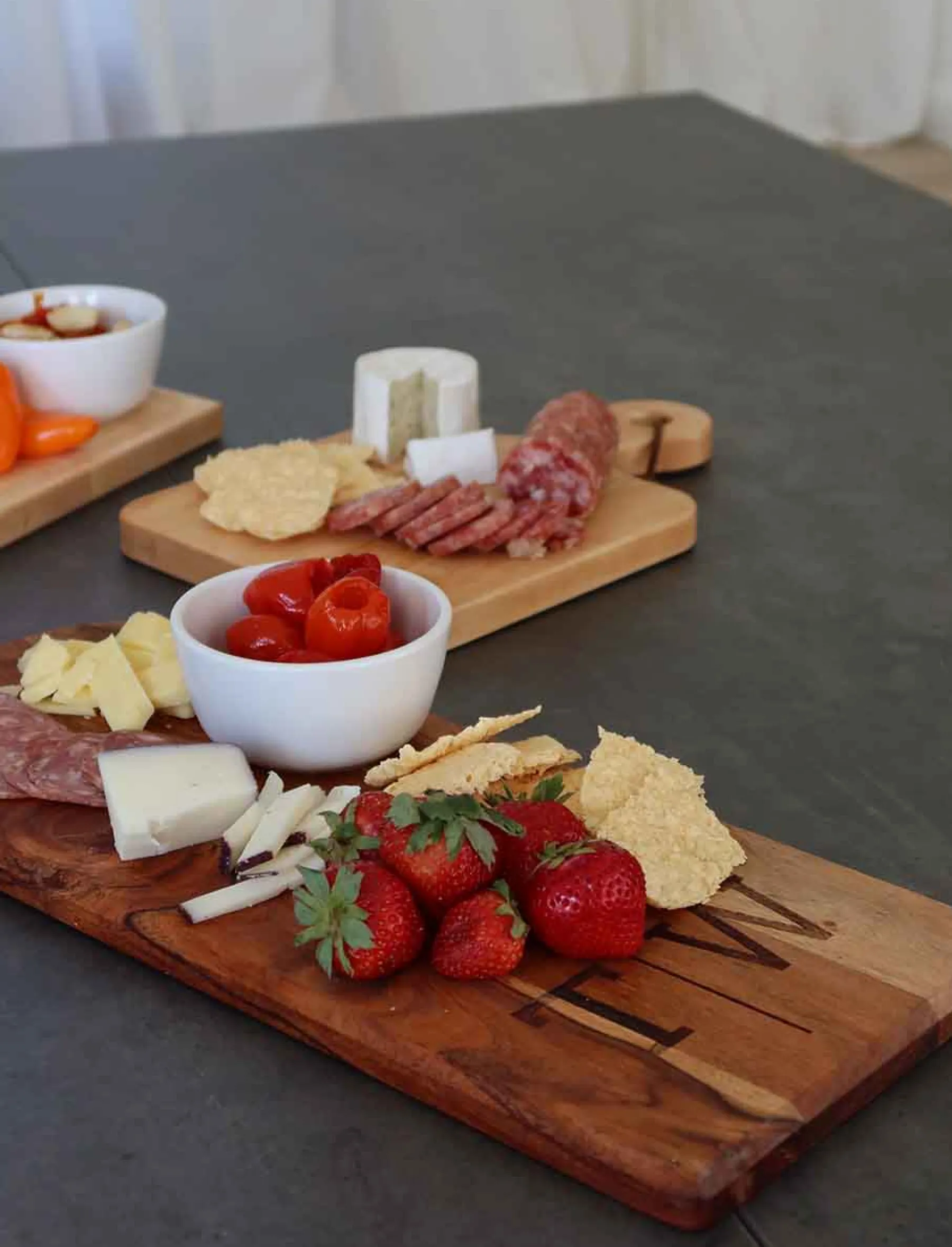 Small leaf acacia wood board with a beveled edge and handle, food-safe mineral oil & sanded finish. Includes bow and gold spreader, ready to be gifted.