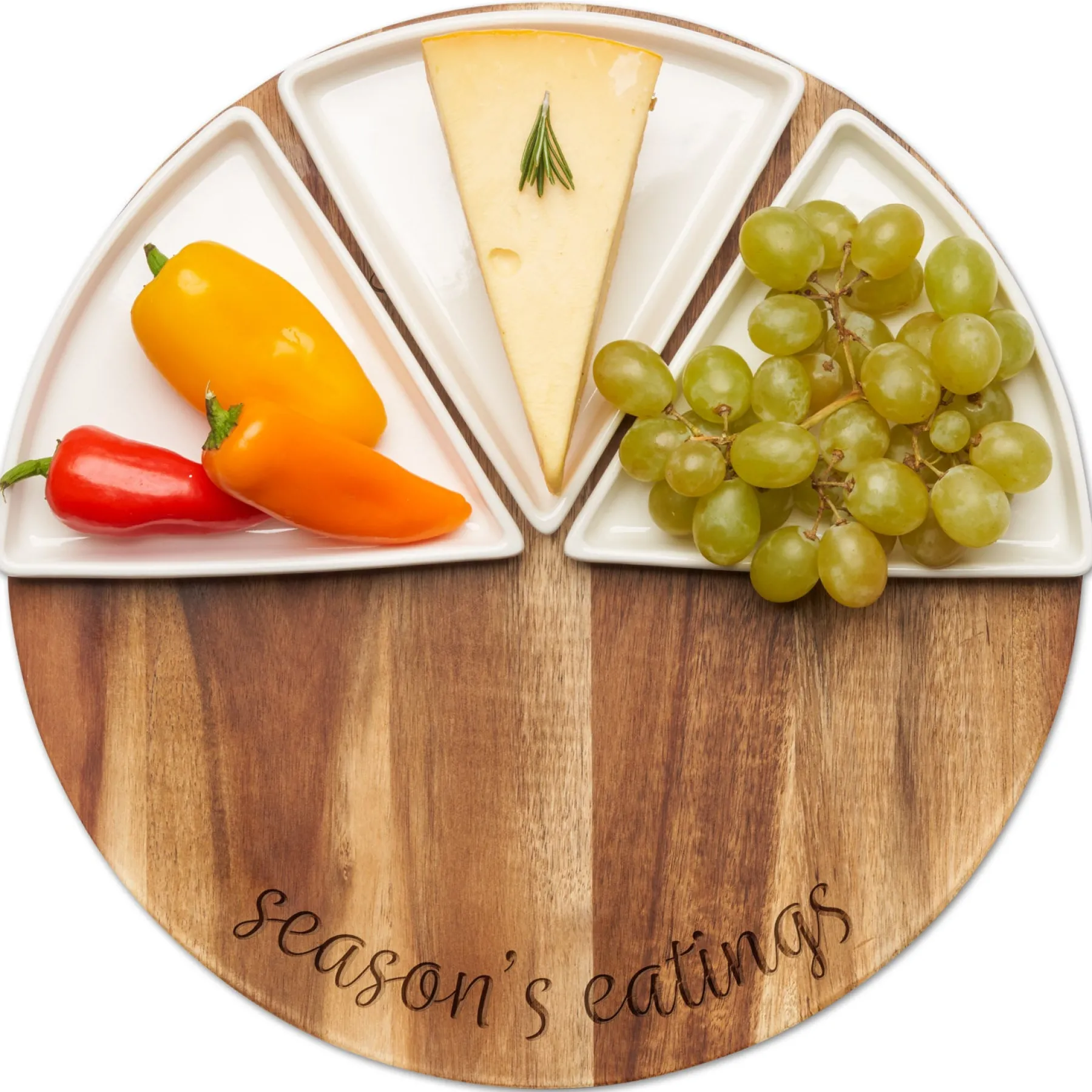 Our 12-inch round board comes with 3 triangular ceramic snack dishes with dimensions of 5.78″ x 5.75″ x .75″ perfect for any snack!