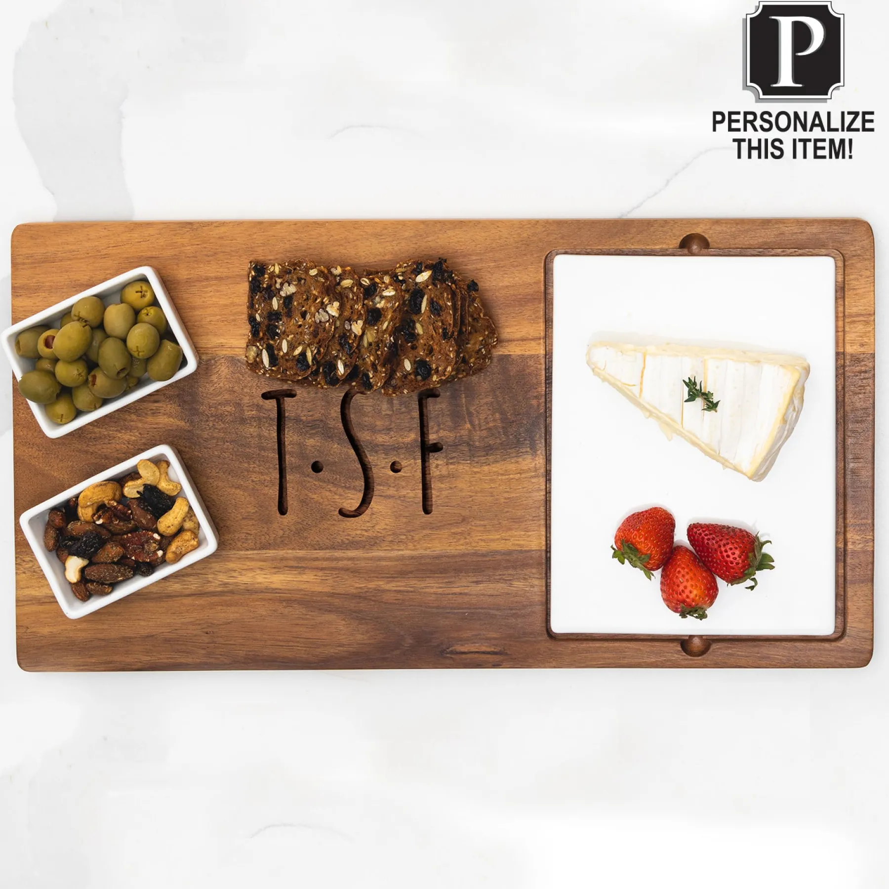 Fete in French means party! Add sophistication to your gathering with a beautiful and modern shaped Acacia wood board and ceramic snack dishes.