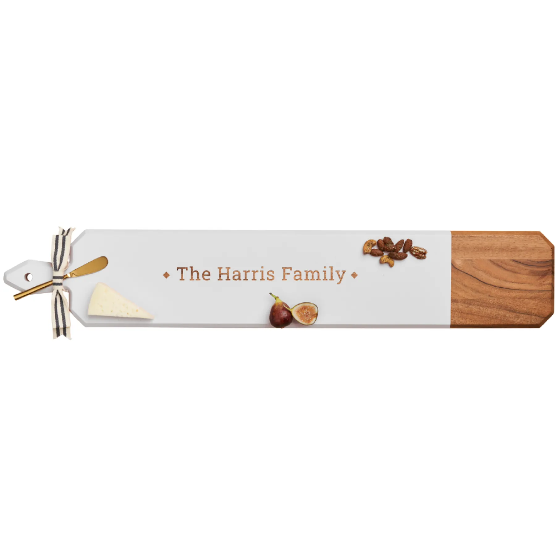 This premium acacia heirloom wood board is beautifully shaped with a food-safe colored finish on top.