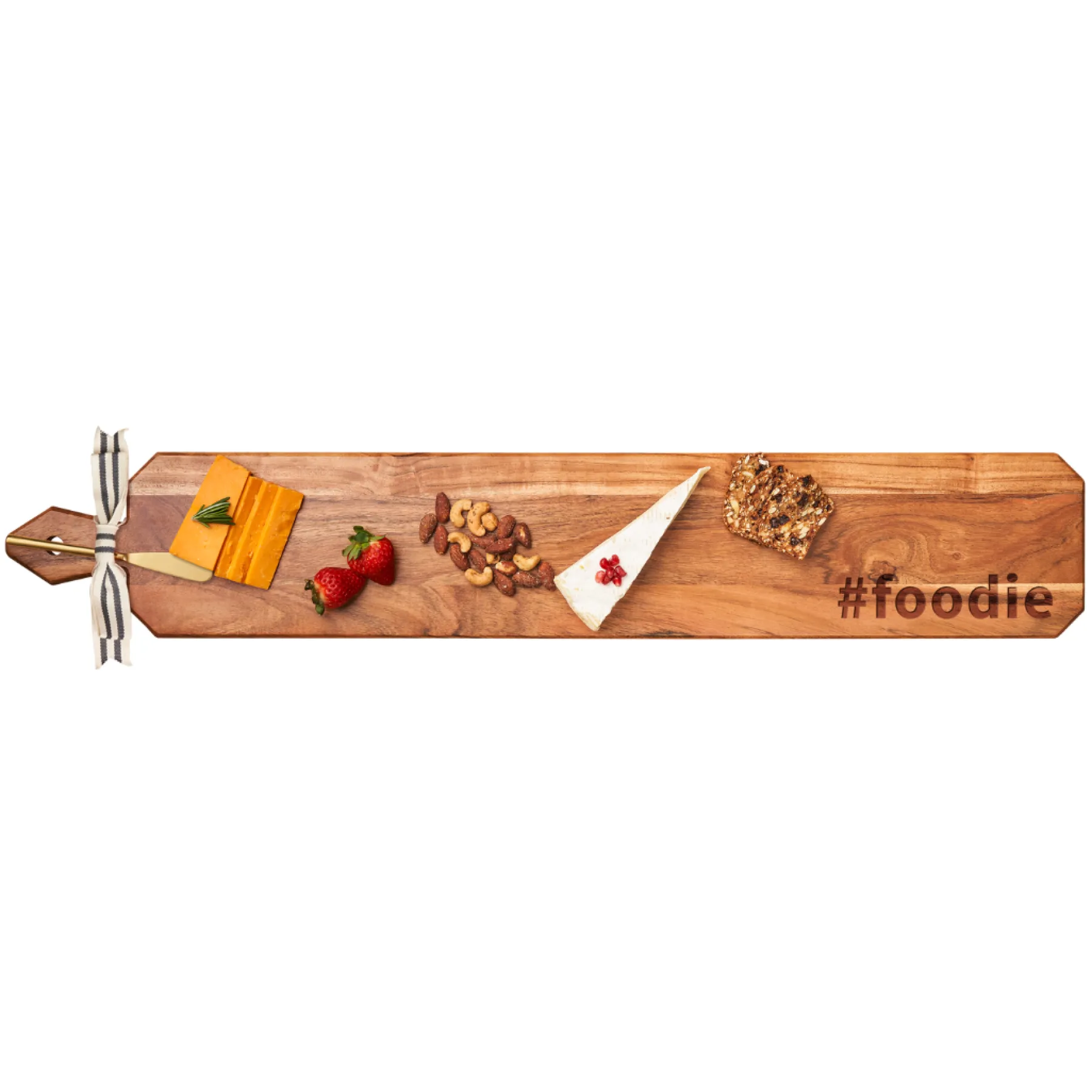 This premium acacia heirloom wood board is beautifully shaped with natural wood finish