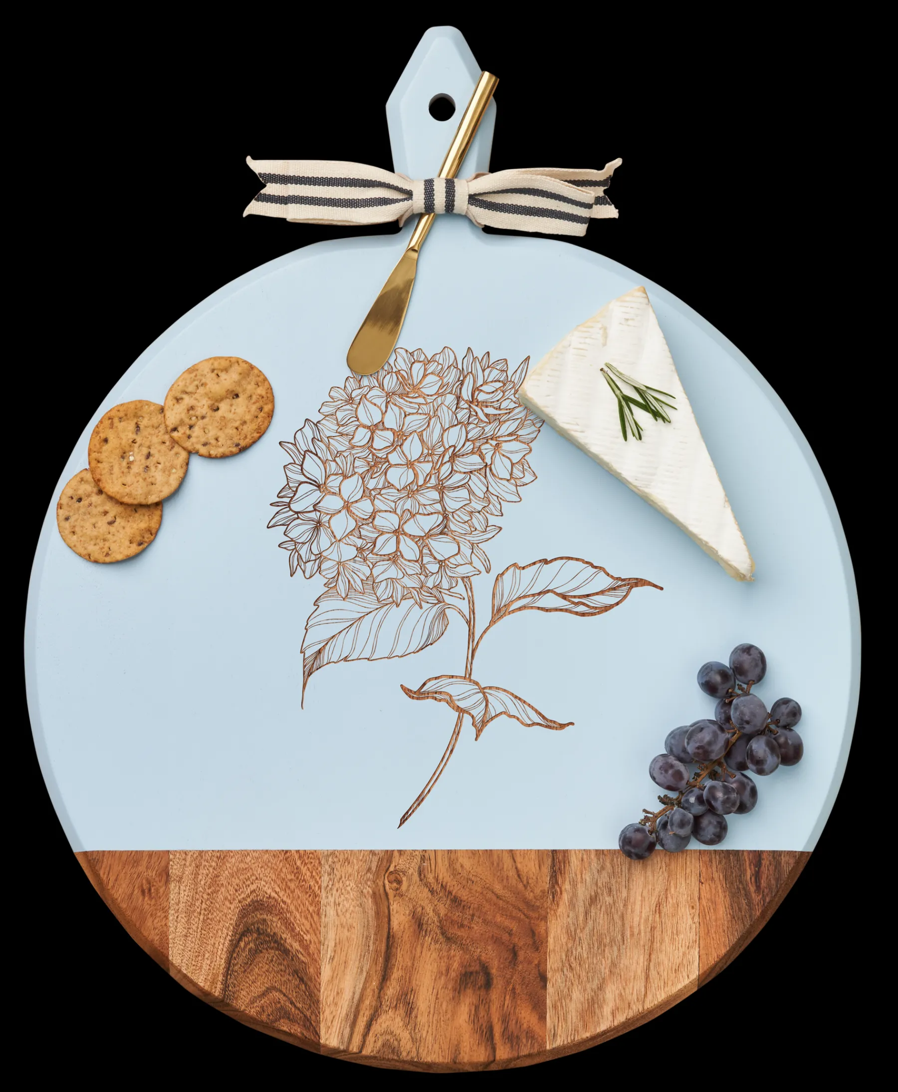 Premium Acacia Heirloom wood board is beautifully round with a food save light blue color on top!