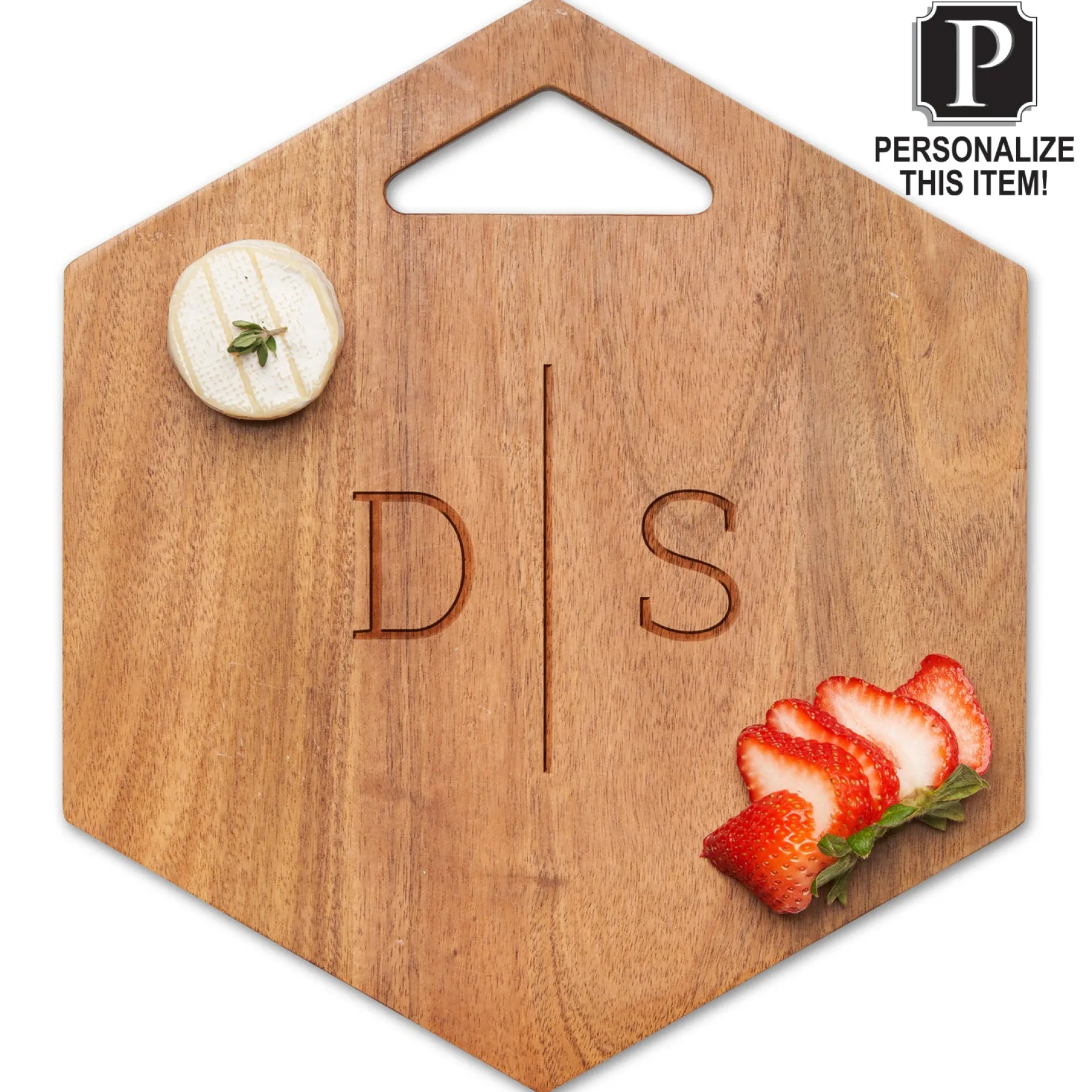 Premium acacia wood board in a sleek hexagon shape with a perfect handle cut out.