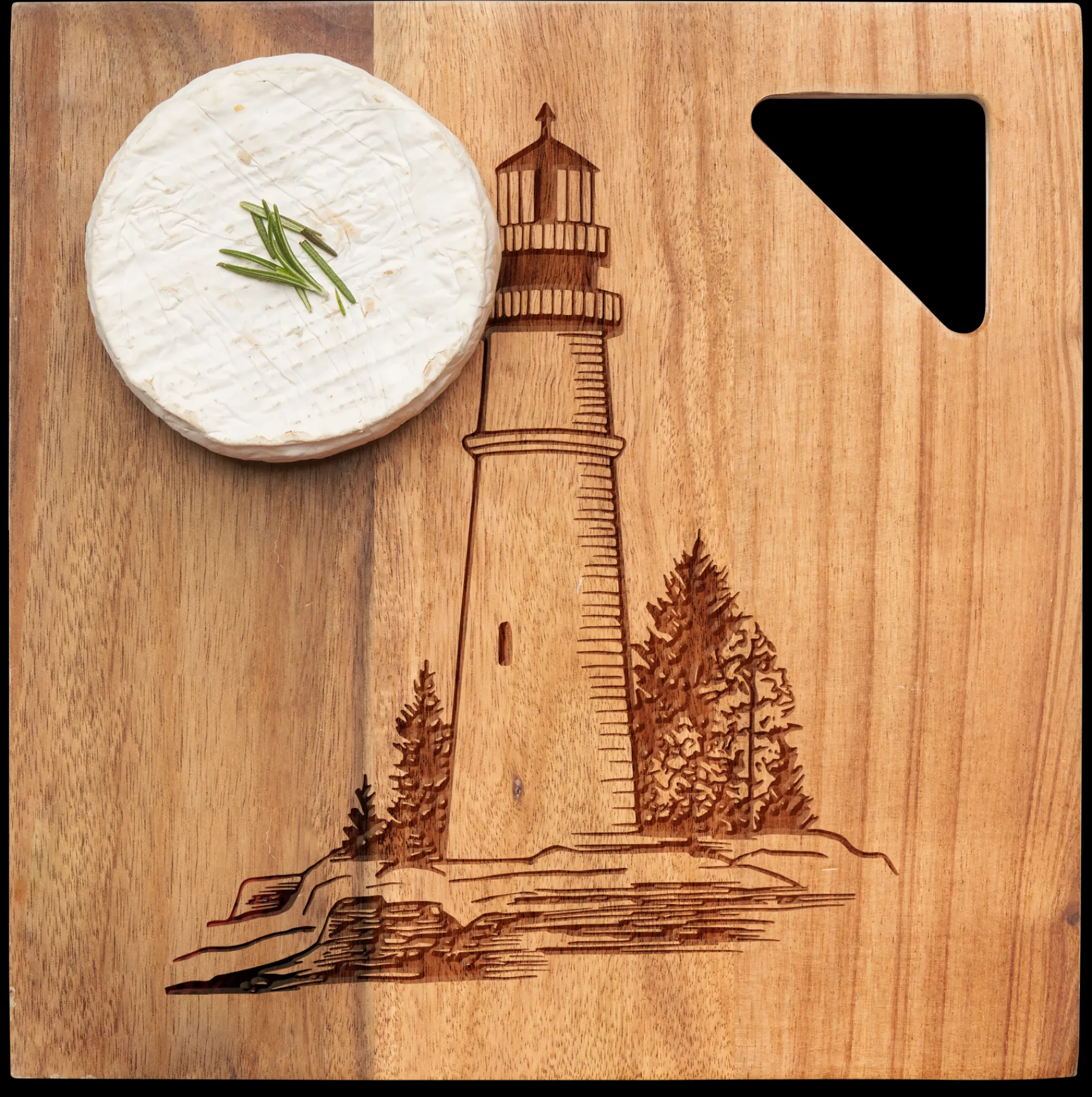 Premium acacia wood board in a sleek square shape with a perfect handle cut out. Perfect for serving, charcuterie, and more.