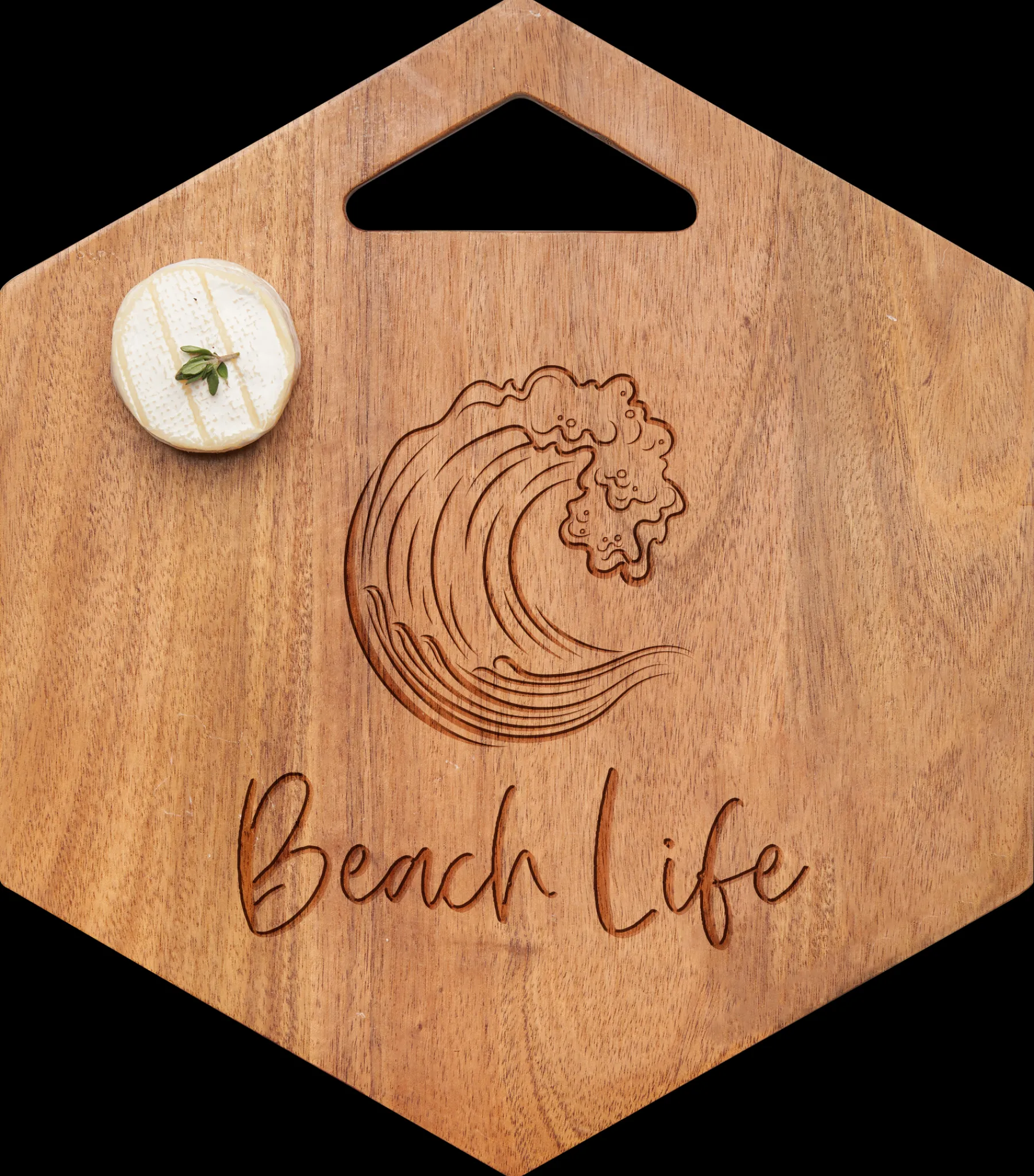 Premium acacia wood board in a sleek hexagon shape with a perfect handle cut out.