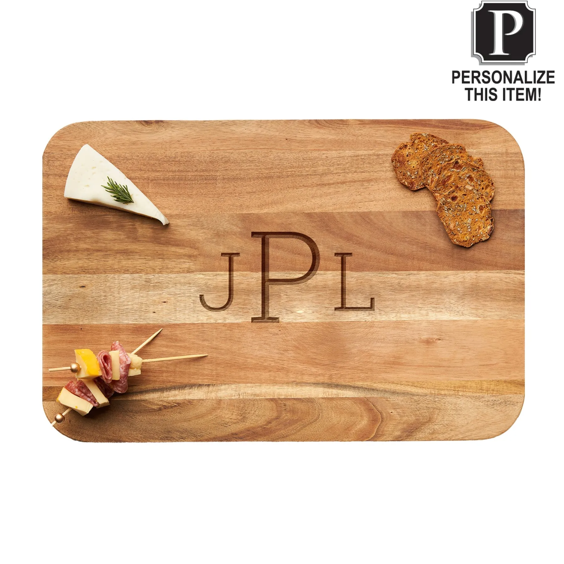 Premium acacia wood board in a sleek rectangle design with rounded corners!