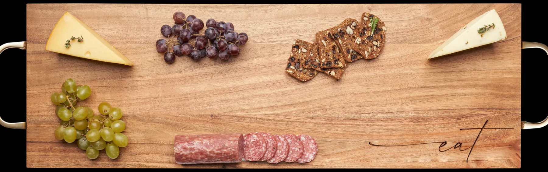 This 30 x 10″ Acacia Serving Board with 5″ curved gold handles.