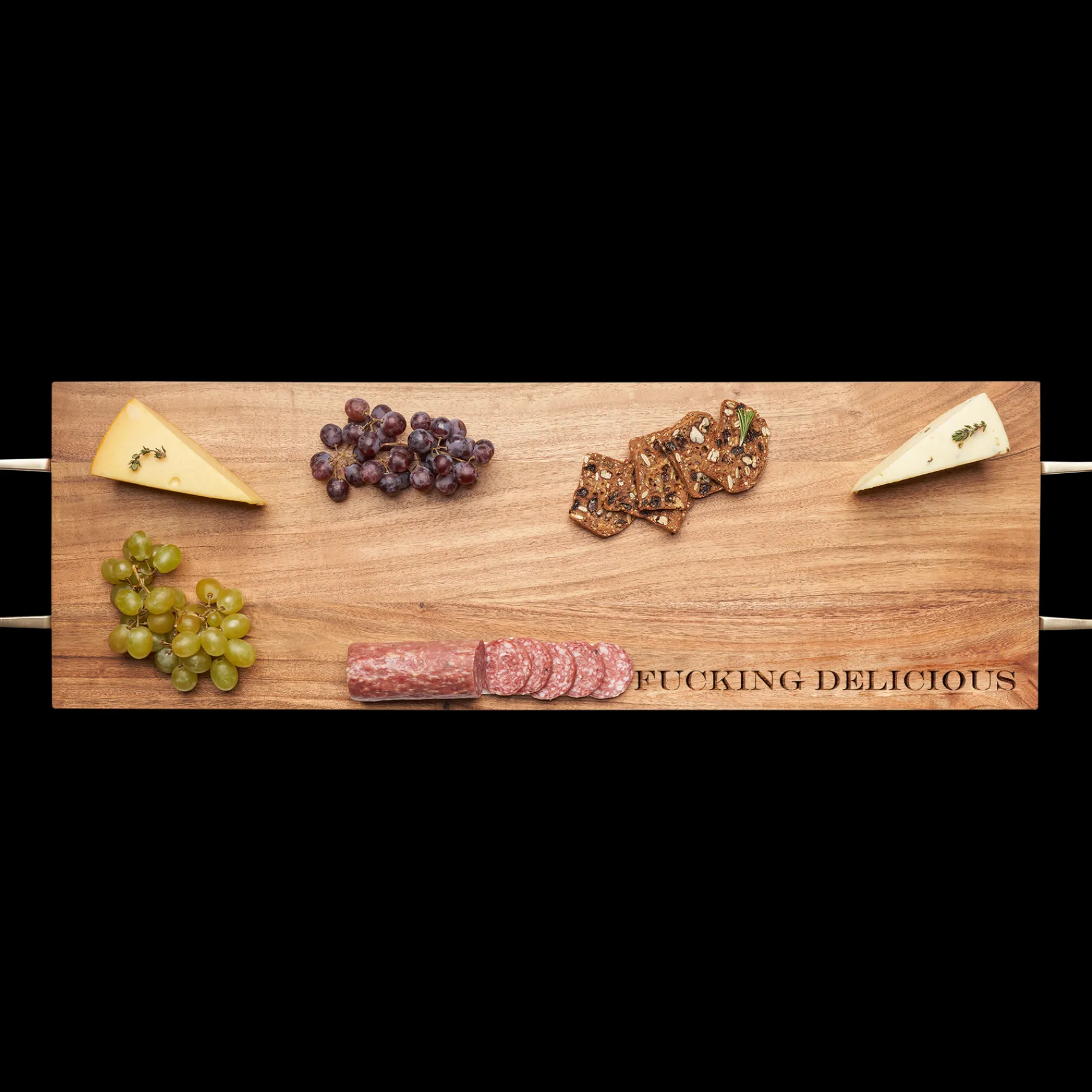 This 30 x 10″ Acacia Serving Board with 5″ straight gold handles.