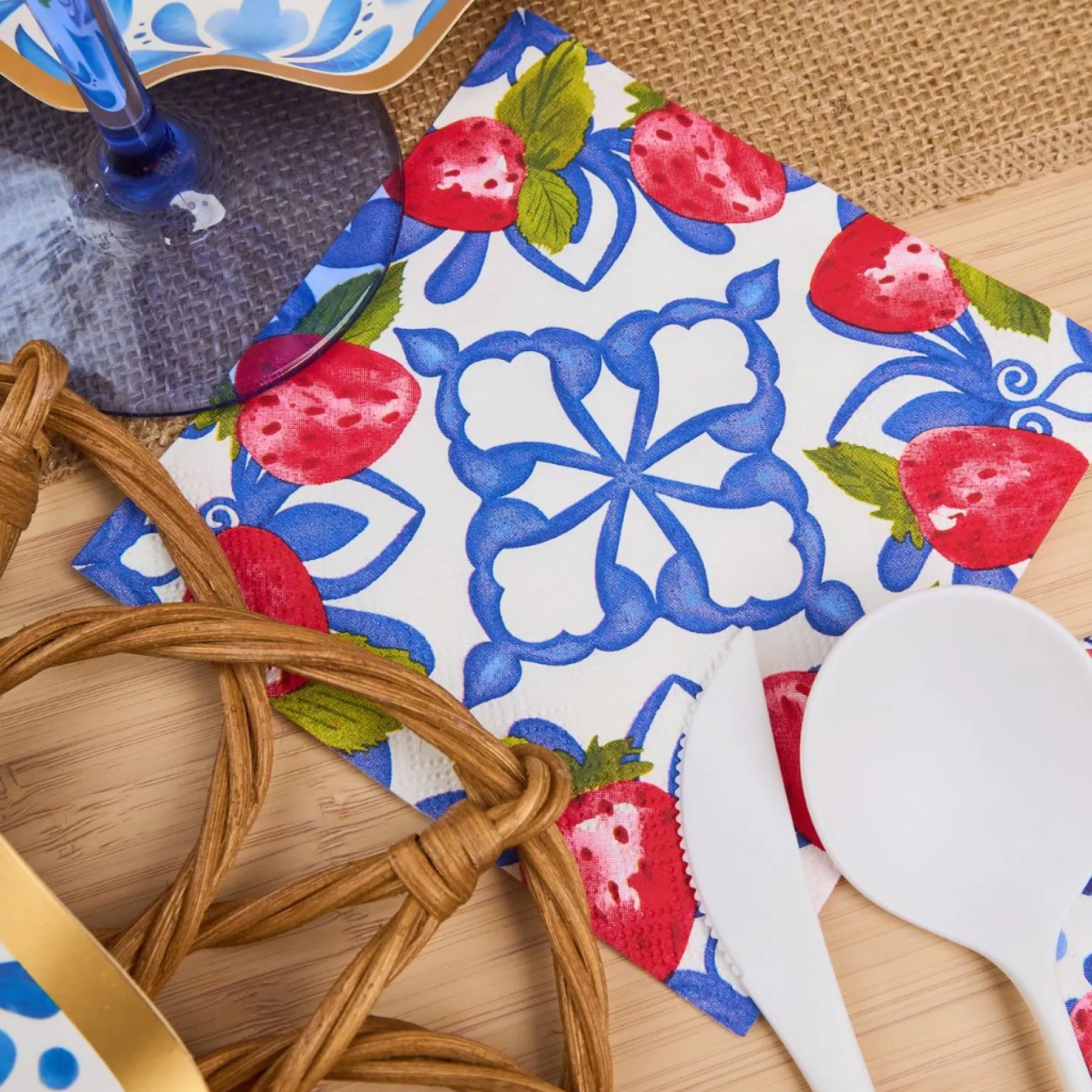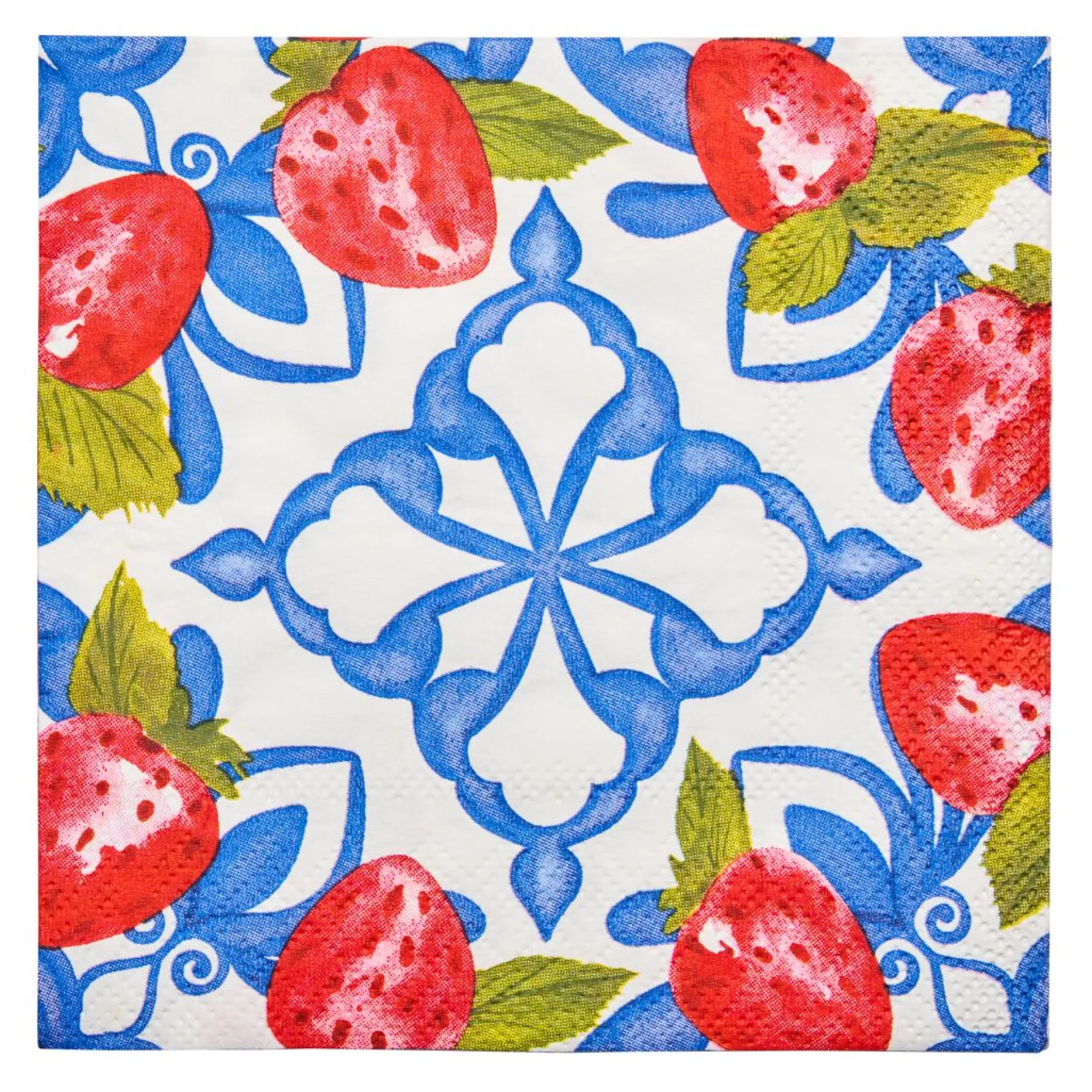 - Color: Blue Moroccan tile with strawberry patterns