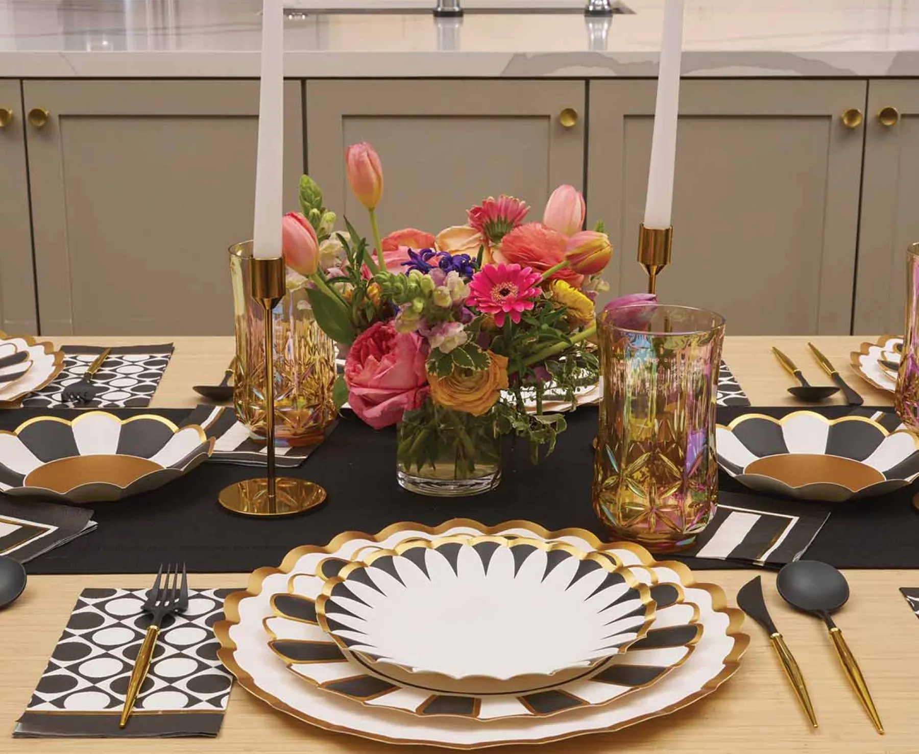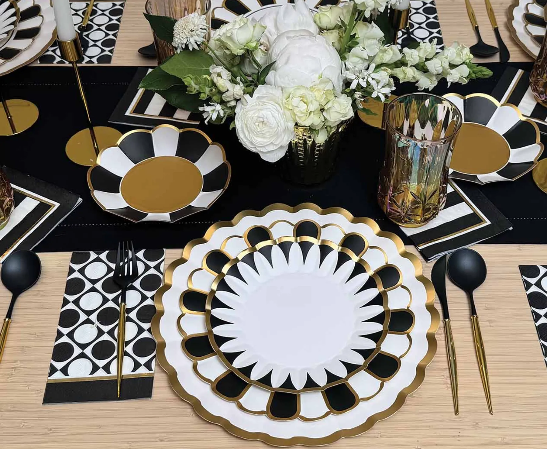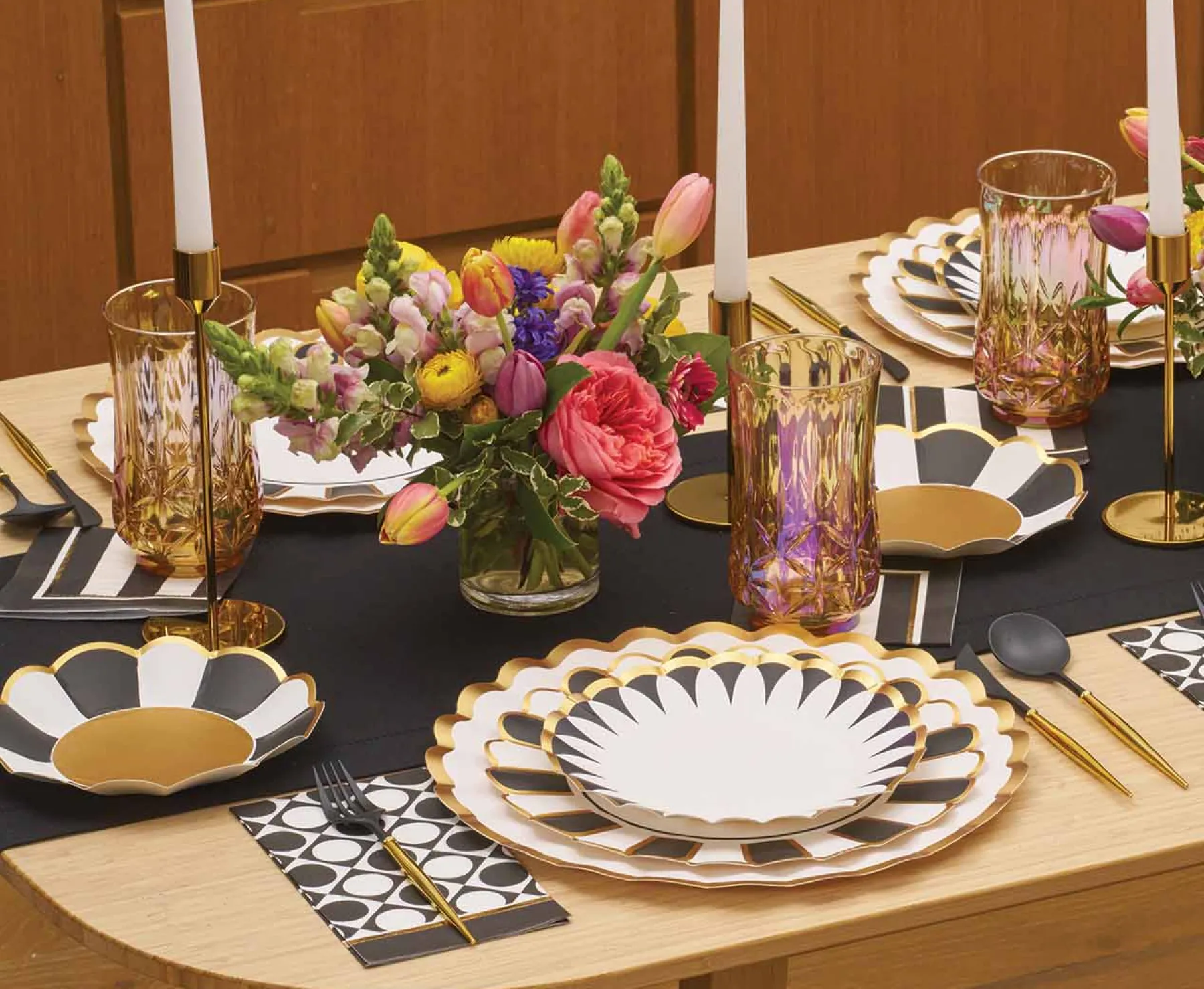 These scalloped-edge black and white salad plates feature a stunning metallic gold trim and are the perfect touch of sophistication for any occasion. These plates are both durable and disposable, allowing you to skip the dirty dishes, without sacrificing quality and style. Your guests will never believe they’re disposable!