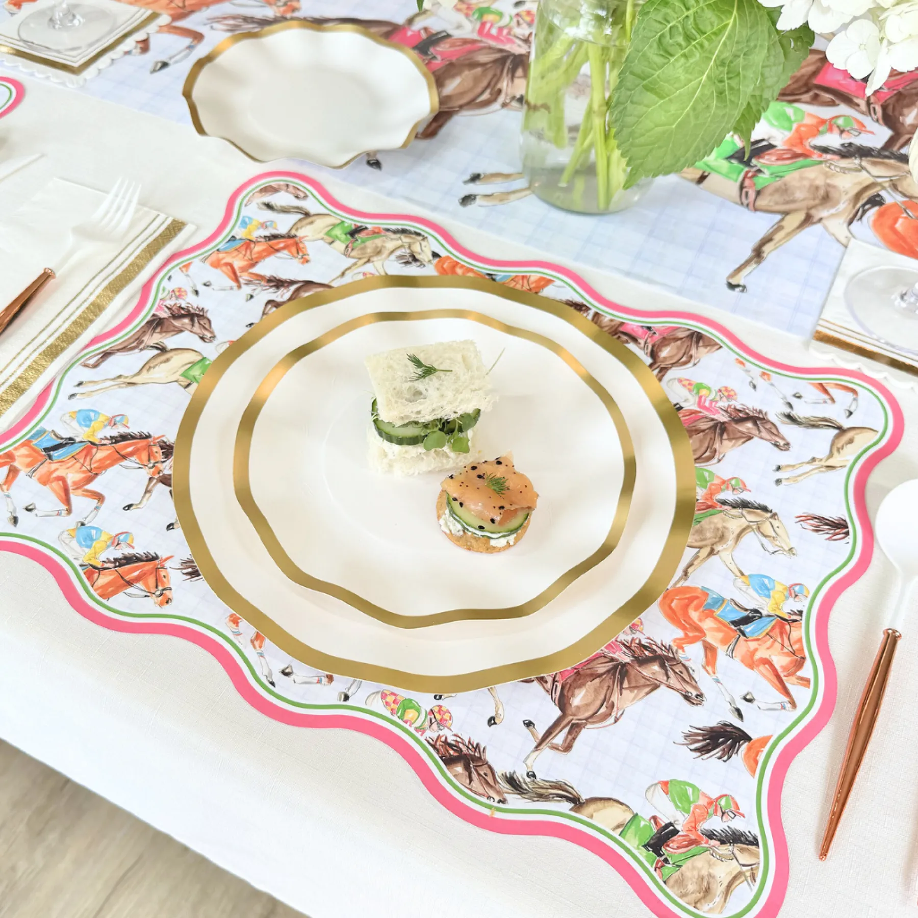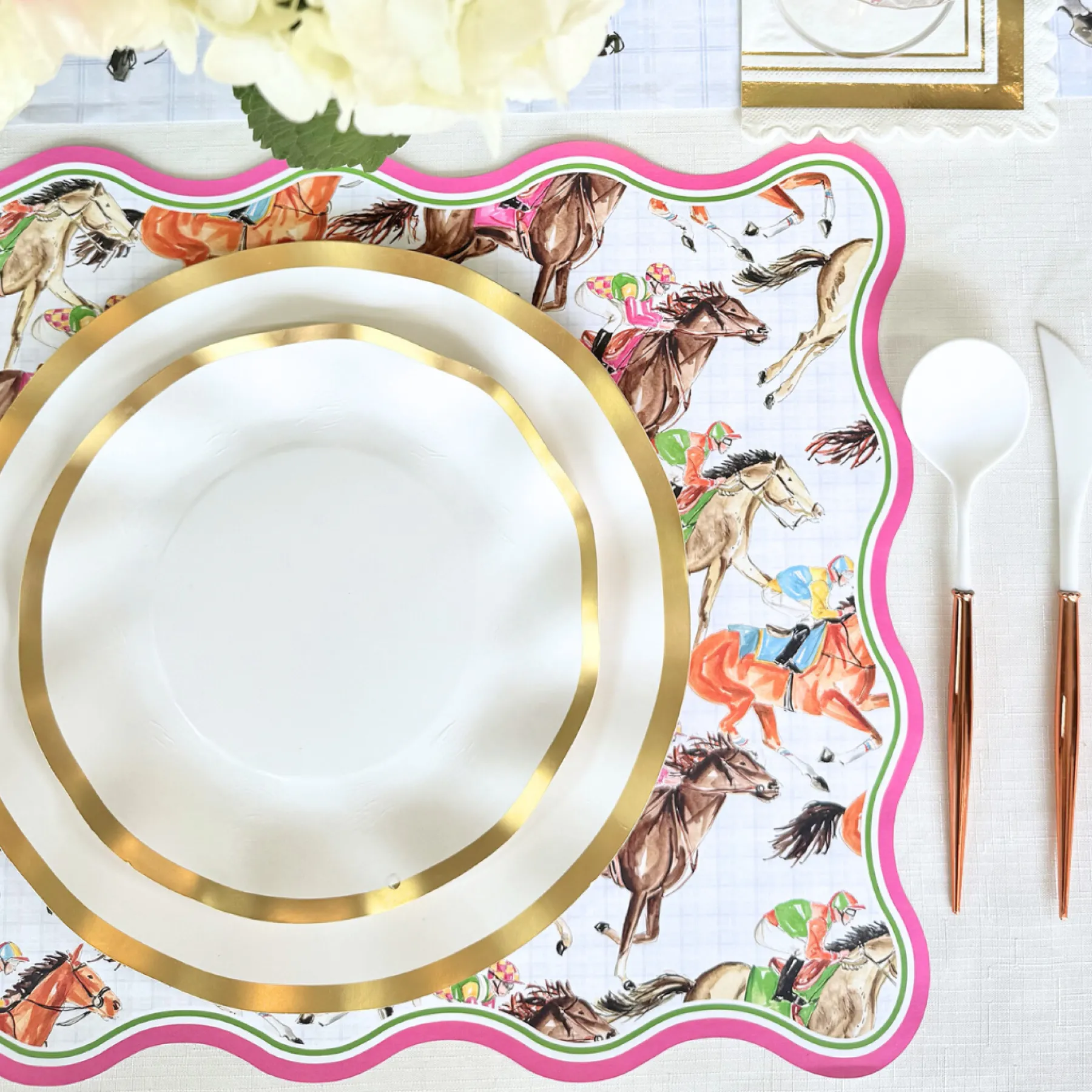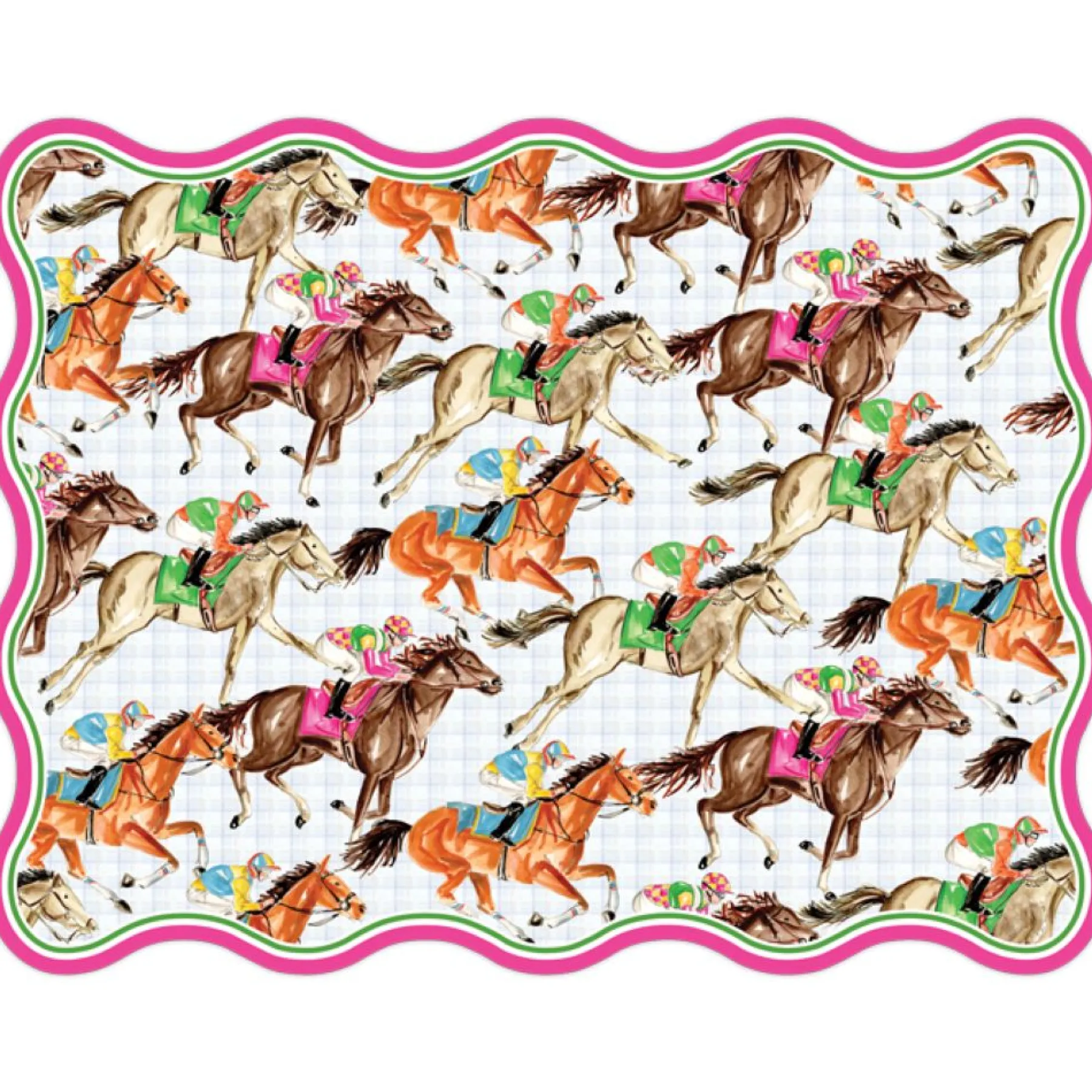 Elevate your table setting with our stylish derby racehorses placemats! Crafted from premium card stock, these placemats add both charm and convenience to your tablescape. The trendy wavy edges bring a modern touch, while the racehorse design sets the perfect scene for your derby day.