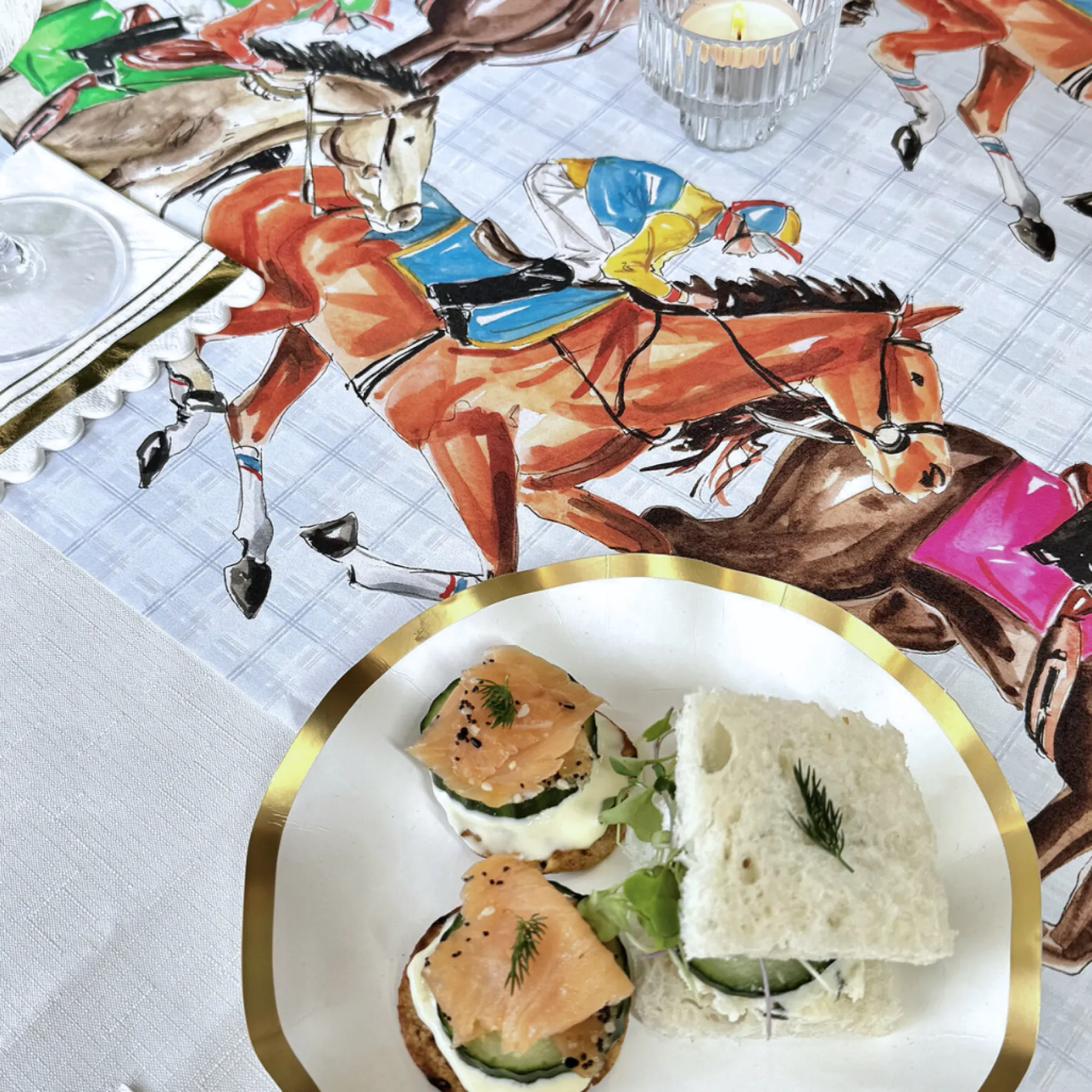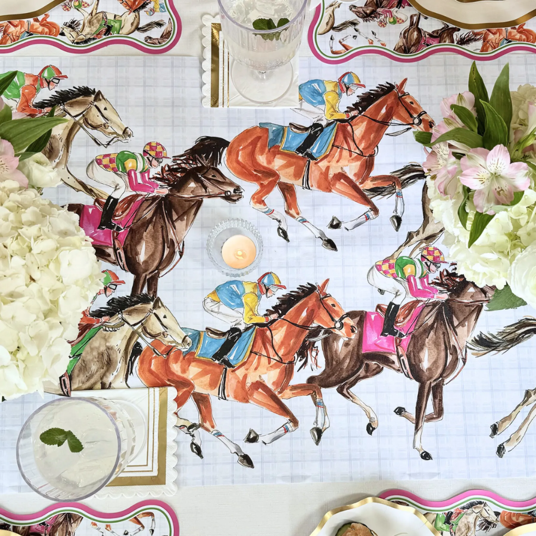 Elevate your tablescape with our derby racehorses disposable table runner. Made from premium paper, this runner adds a polished touch to your table while keeping cleanup effortless. Simply roll it out for an instant upgrade to your party—no ironing, no washing, just effortless style!