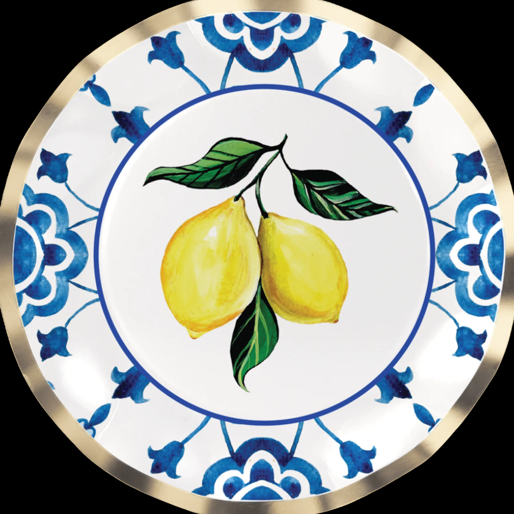 These stunning paper plates will make you want to host a party at the first chance you get! These ruffled foil edge plates show an intricate blue pattern and lemons on a white background! Add a touch of elegance to your holiday gatherings! Impress your guests with these perfect pieces. Your guests will not believe that these are paper plates! Pairs beautifully with our Bella plastic cutlery, matching napkins, paper baking cups, and party picks!