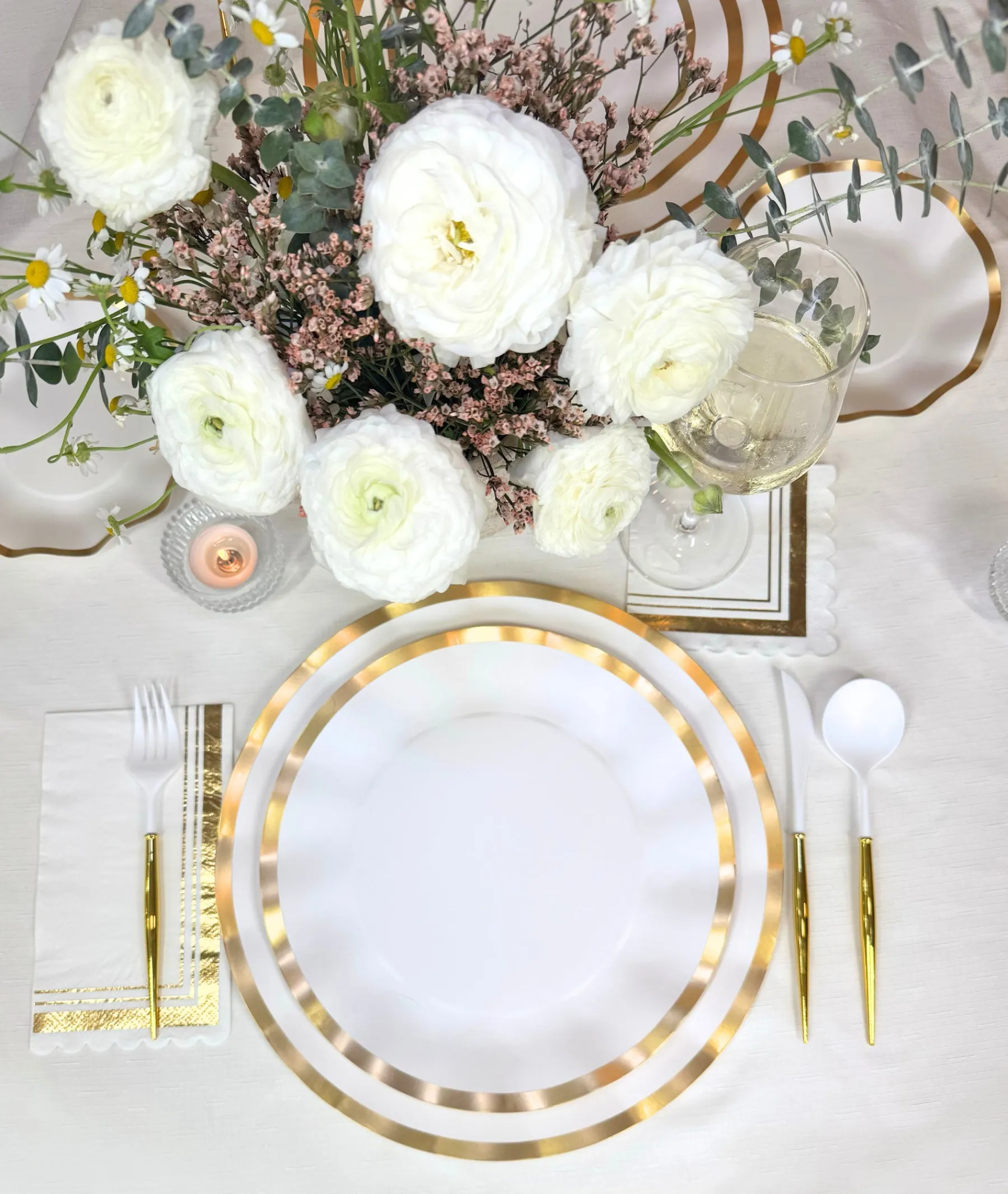Hosting Made Easy: Take the guesswork out of decor with our tablescape-in-a- box! Our decorative disposable plates allow you to create an Instagram-worthy table effortlessly.
