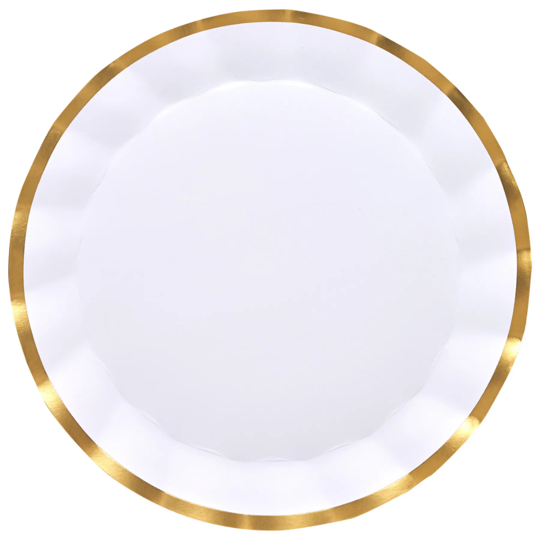 These scalloped-edge white charger plates feature a stunning metallic gold trim and are the perfect touch of sophistication for any occasion. These plates are both durable and disposable, allowing you to skip the dirty dishes, without sacrificing quality and style. Your guests will never believe they’re disposable!