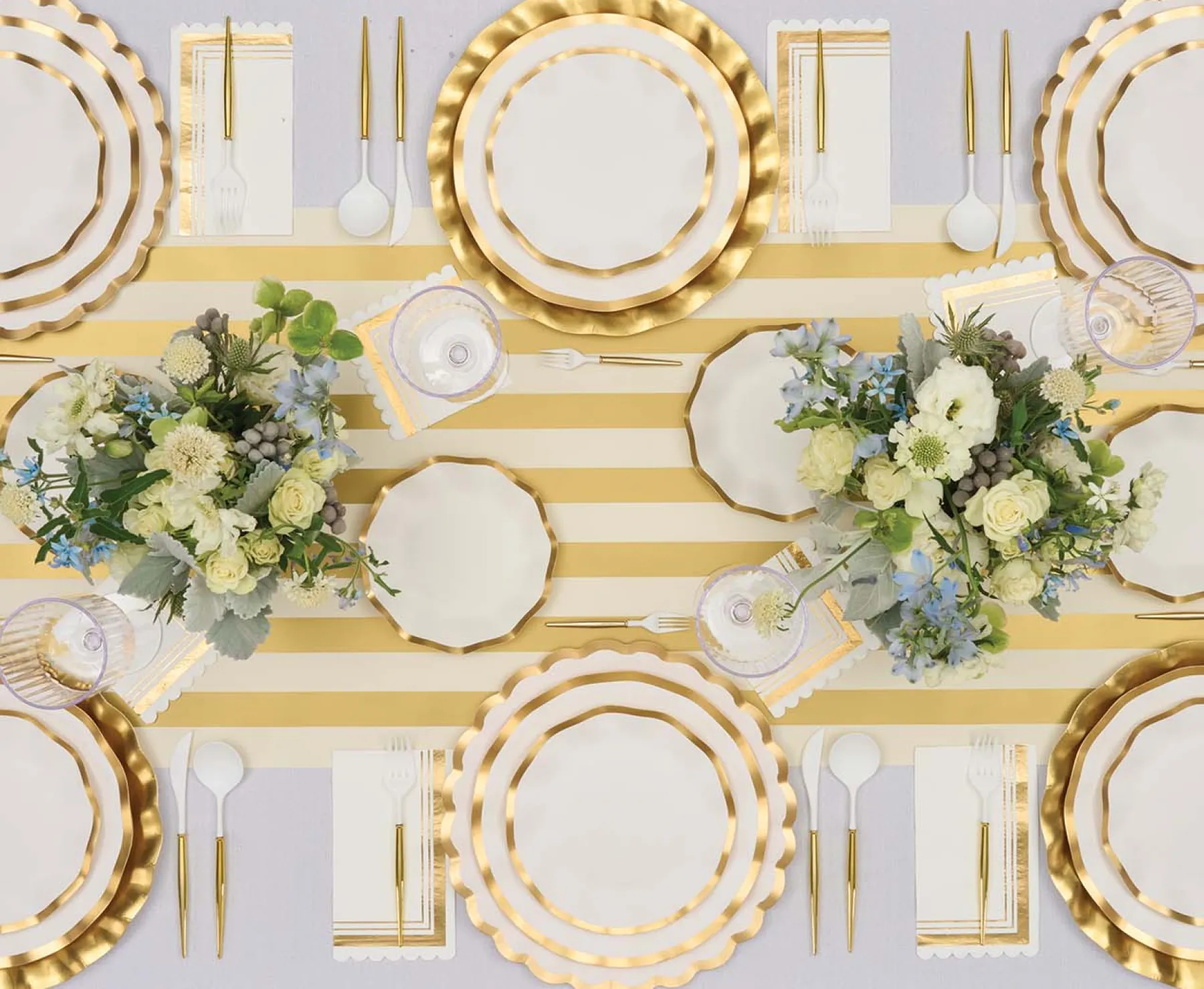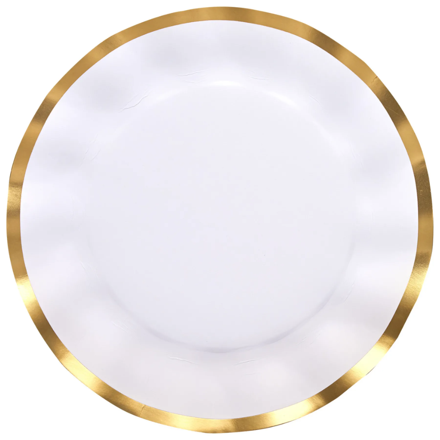 These scalloped-edge white dinner plates feature a stunning metallic gold trim and are the perfect touch of sophistication for any occasion. These plates are both durable and disposable, allowing you to skip the dirty dishes, without sacrificing quality and style. Your guests will never believe they’re disposable!