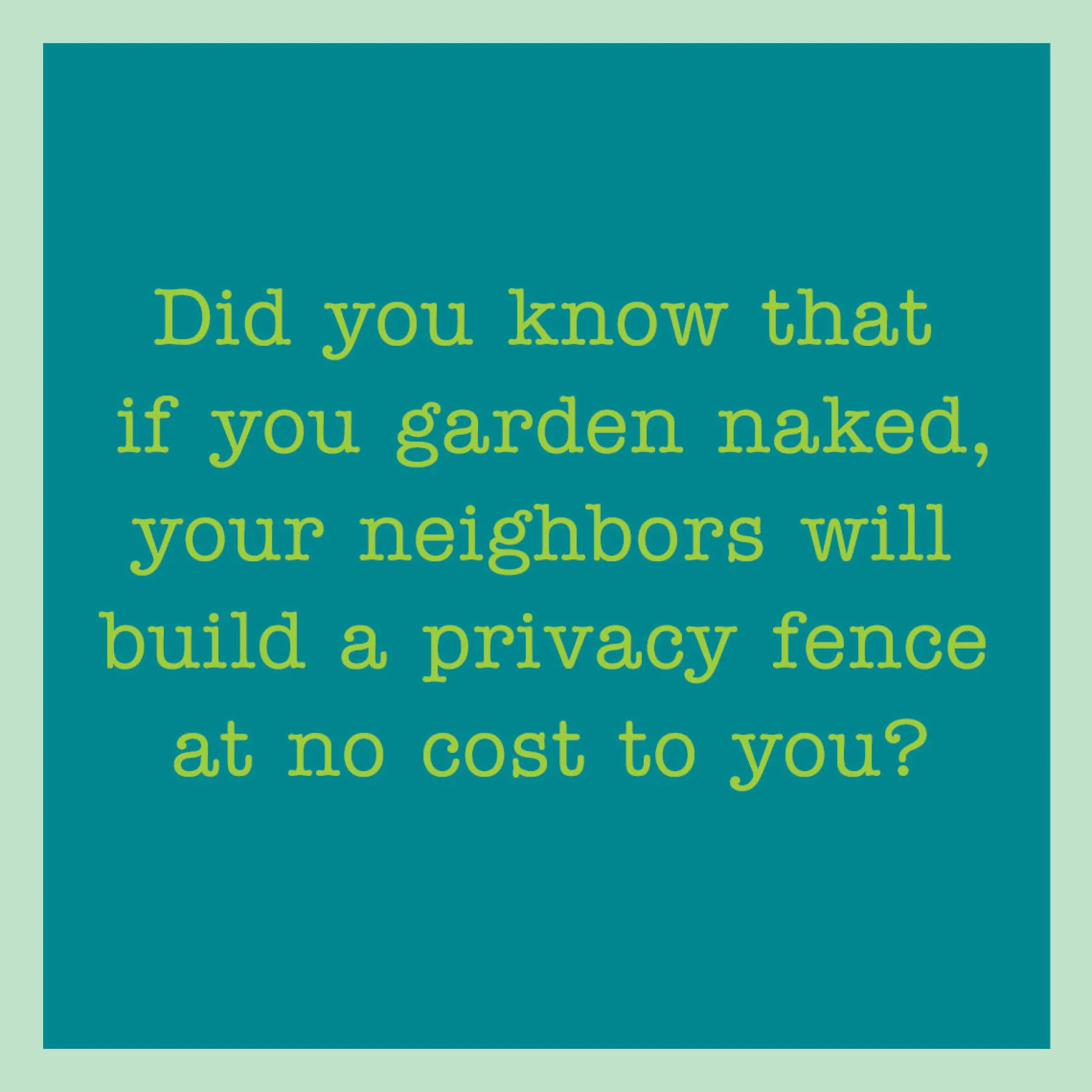 “Did you know that if you garden naked, your neighbors will build a privacy fence at no cost to you?”