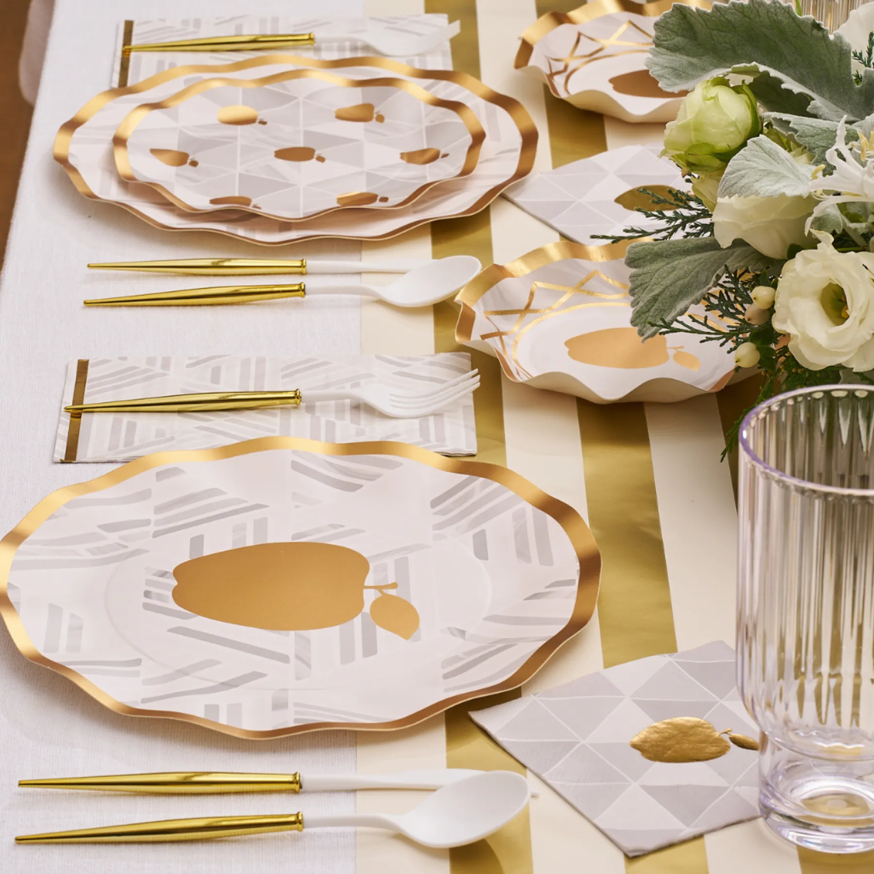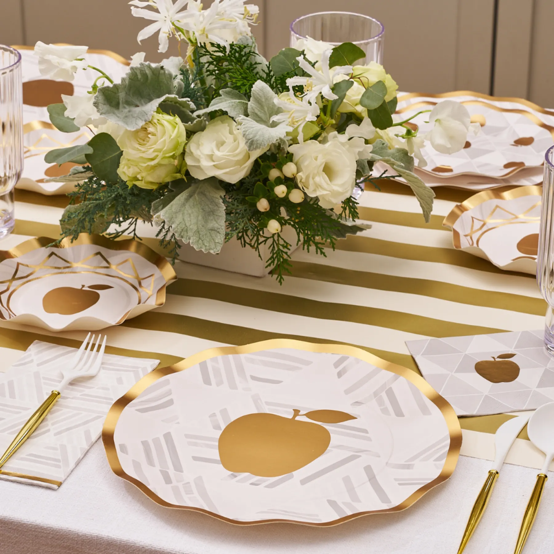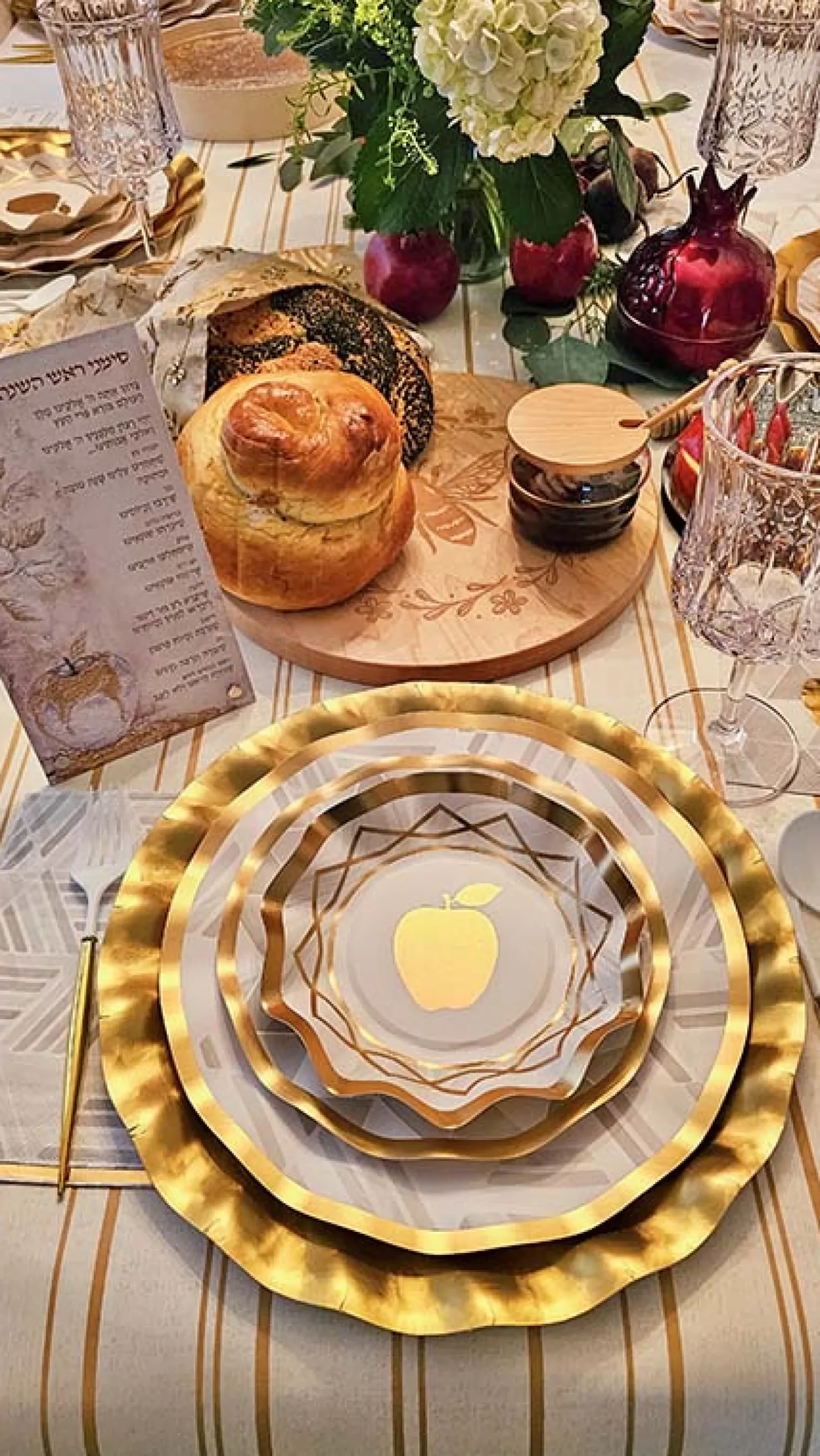 OMG It’s Paper: Celebrate Autumn with this exquisite Golden Apple Table Setting, adorned in the warm hues of the season. Our signature wavy-edge plates, enhanced with gold foil accents, harmoniously blend modern style with timeless elegance. This white and gold ensemble creates a stunning, luxurious tablescape that will transform your meal into a picture-perfect occasion. Your guests will be amazed to discover that it’s all disposable! This golden apple table setting was designed especially for Rosh Hashanah, symbolizing the hope for a sweet new year.