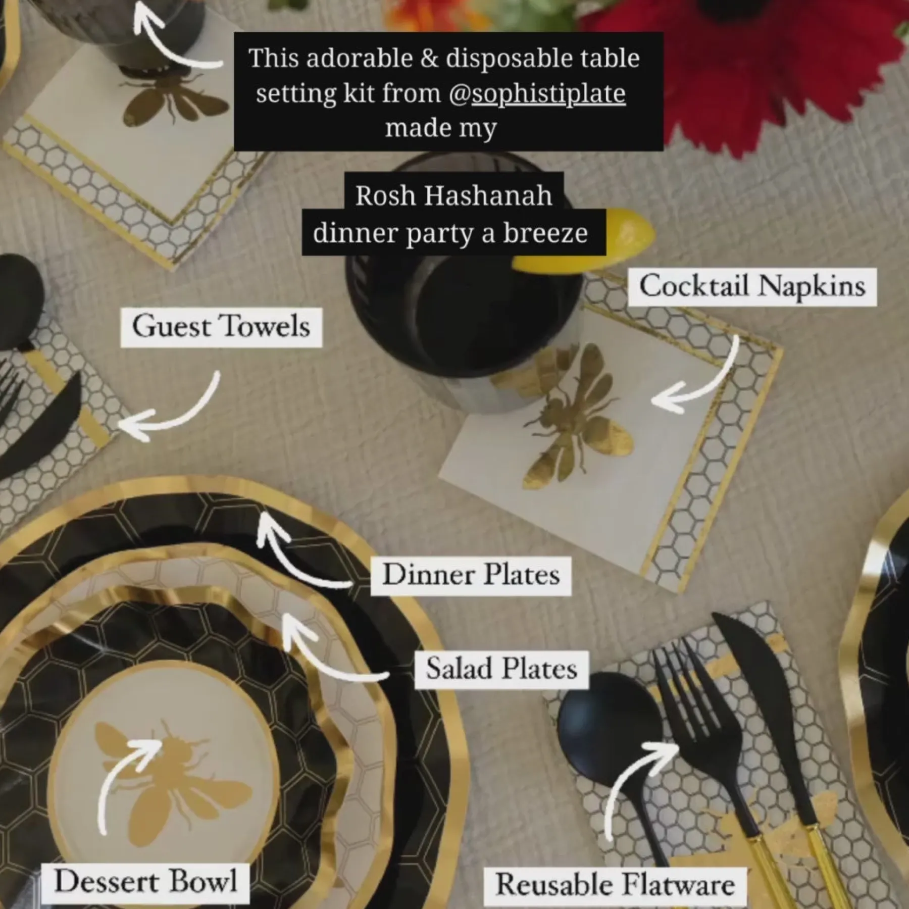 OMG It’s Paper: This gorgeous black and gold honeybee pattern incorporates a metallic gold rim that pairs perfectly with our Gold & White Bella cutlery . Your guests will not believe this is all disposable! Perfect for any elegant event, holiday, and perfect for Rosh Hashana!