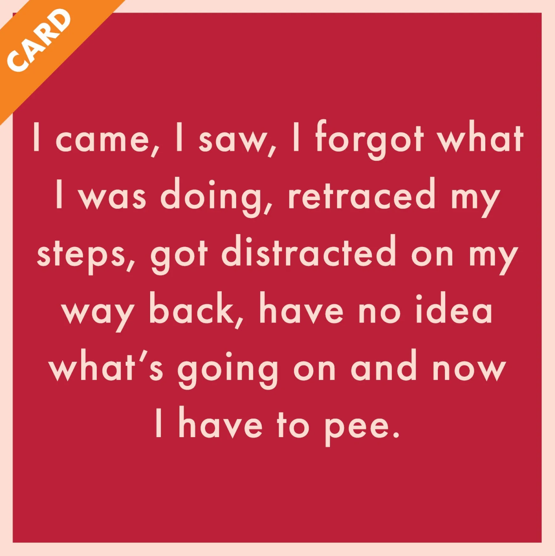 “I came, I saw, I forget what I was doing, retraced my steps, got distracted on my way back, have no idea what’s going on and now i have to pee.”
