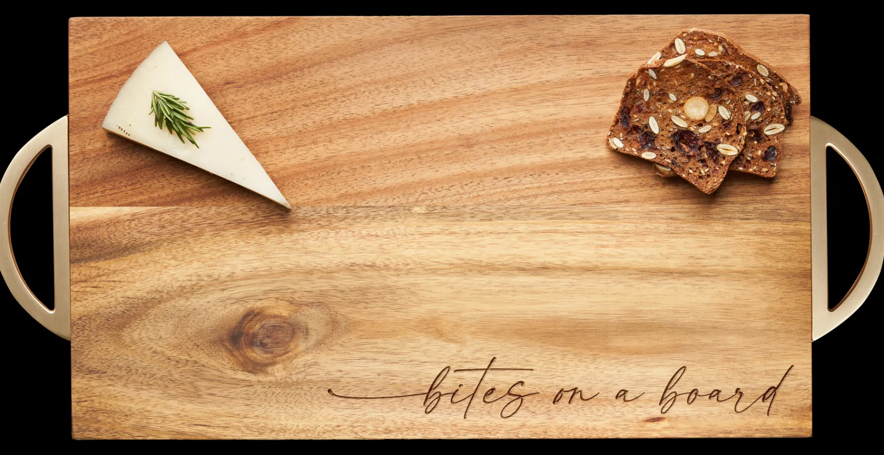 Premium acacia wood board in a sleek rectangle design with gold handles