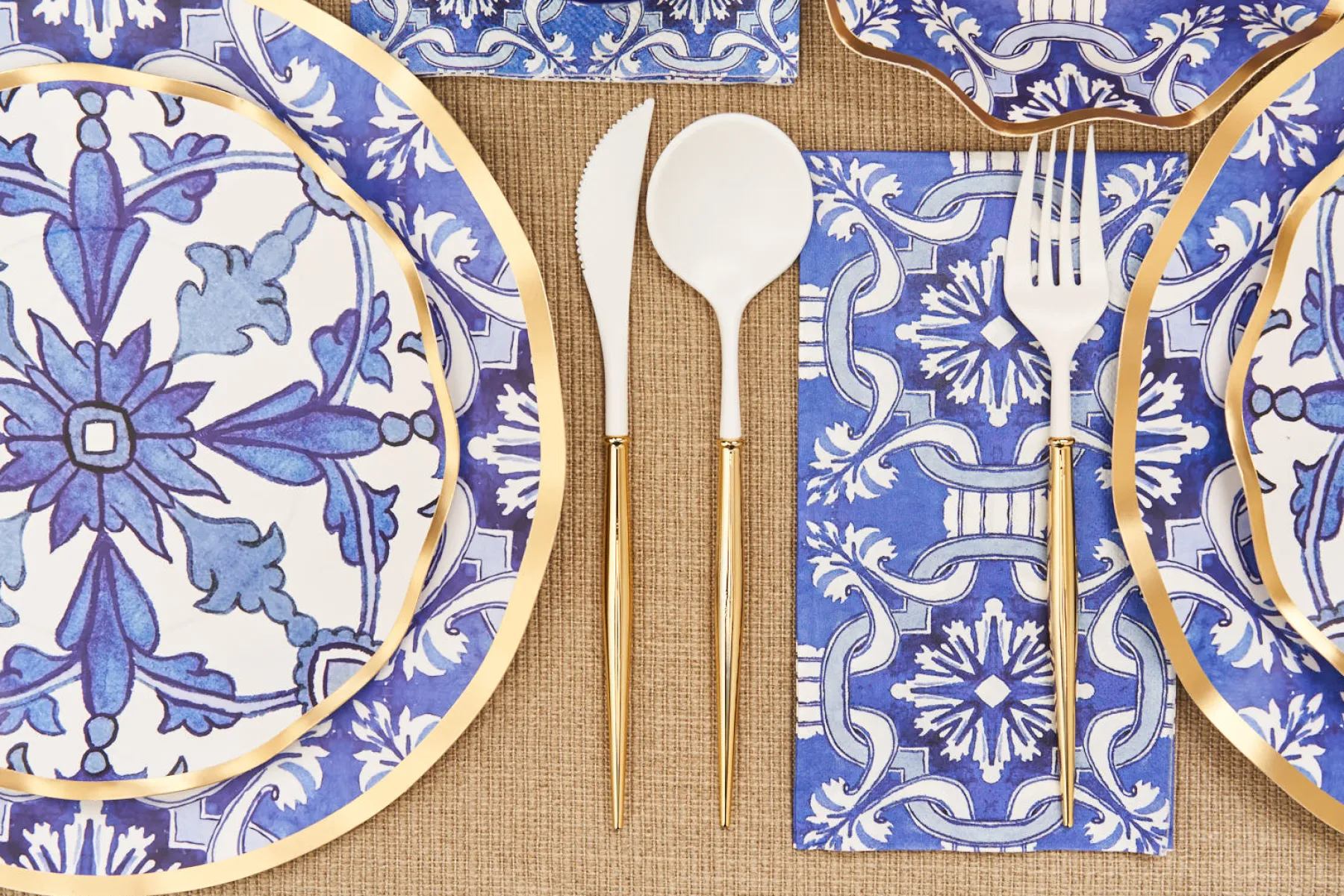 These metallic gold ruffled edge blue & white beauties feature our breathtaking Moroccan tile inspired pattern! These will make you want to host a party at the first chance you get! Our signature ruffled edge with metallic foil accents add a touch of elegance to any event and will impress your guests! They will not believe that these are paper plates! Pairs beautifully with our Gold or Navy Bella plastic cutlery, Satin Gold paper plates, metallic baking cups, and party picks!