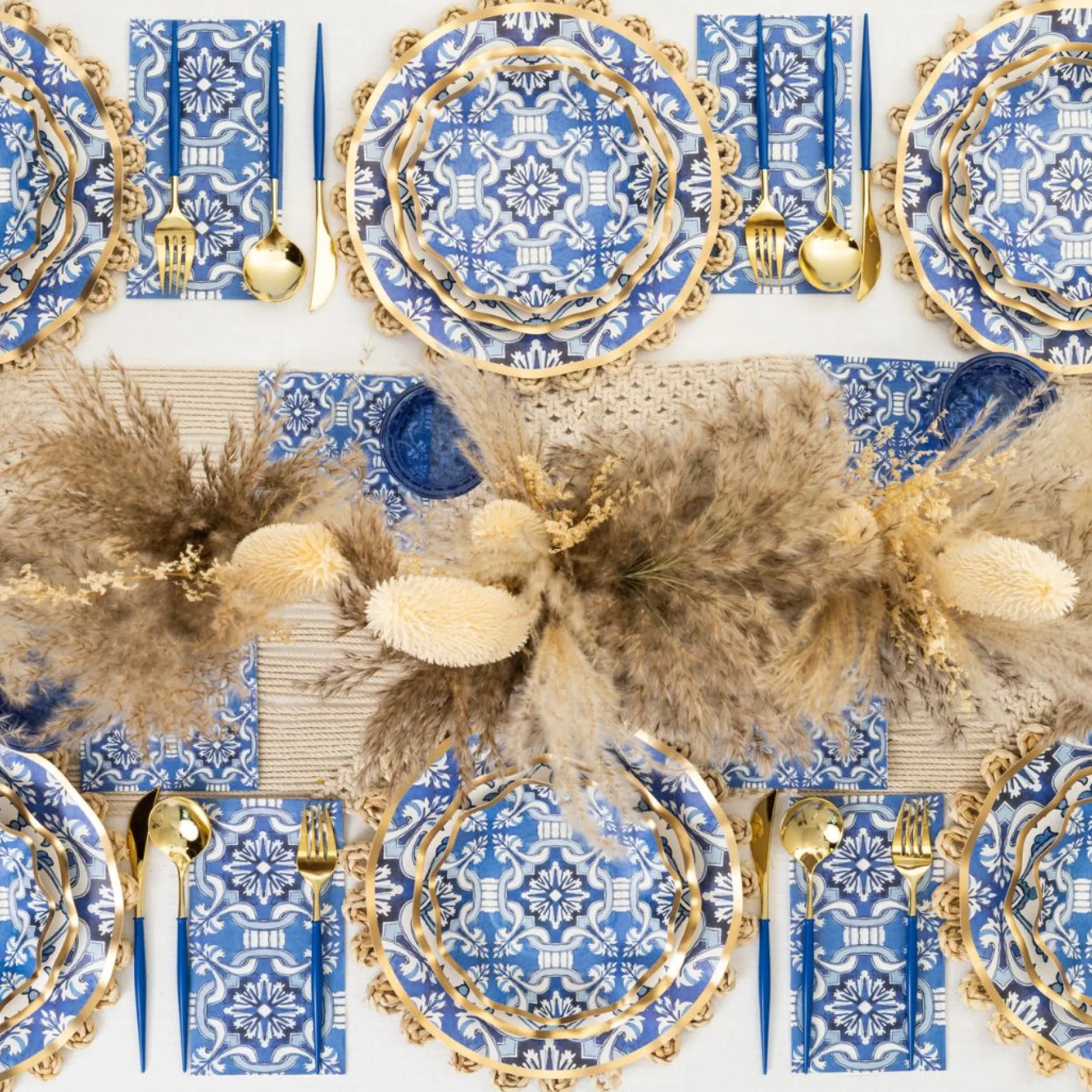 This timeless blue & white Moroccan tile pattern incorporates a metallic gold rim that pairs perfectly with our Gold Bella cutlery & Satin Gold wavy plates. Your guests will not believe this is all disposable!