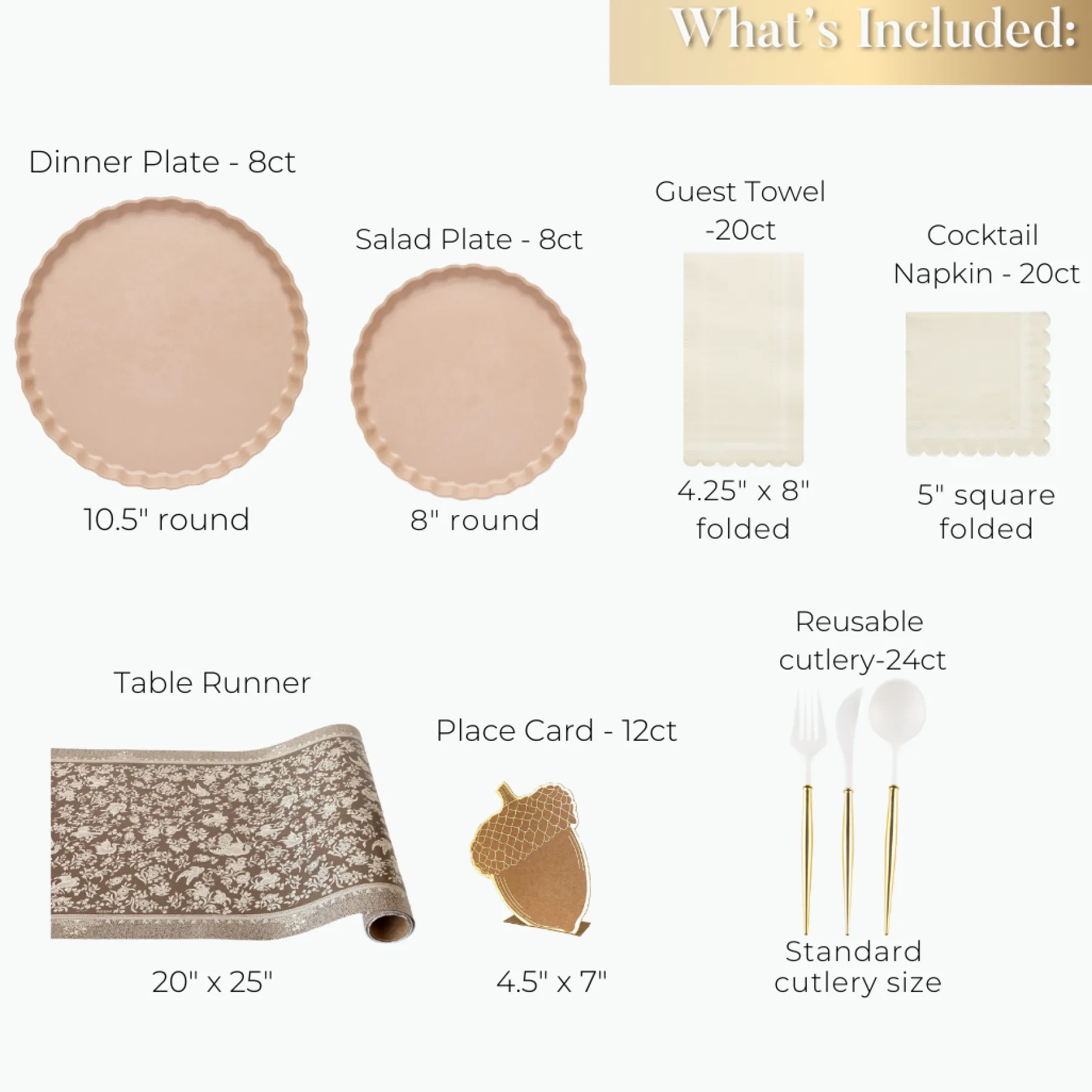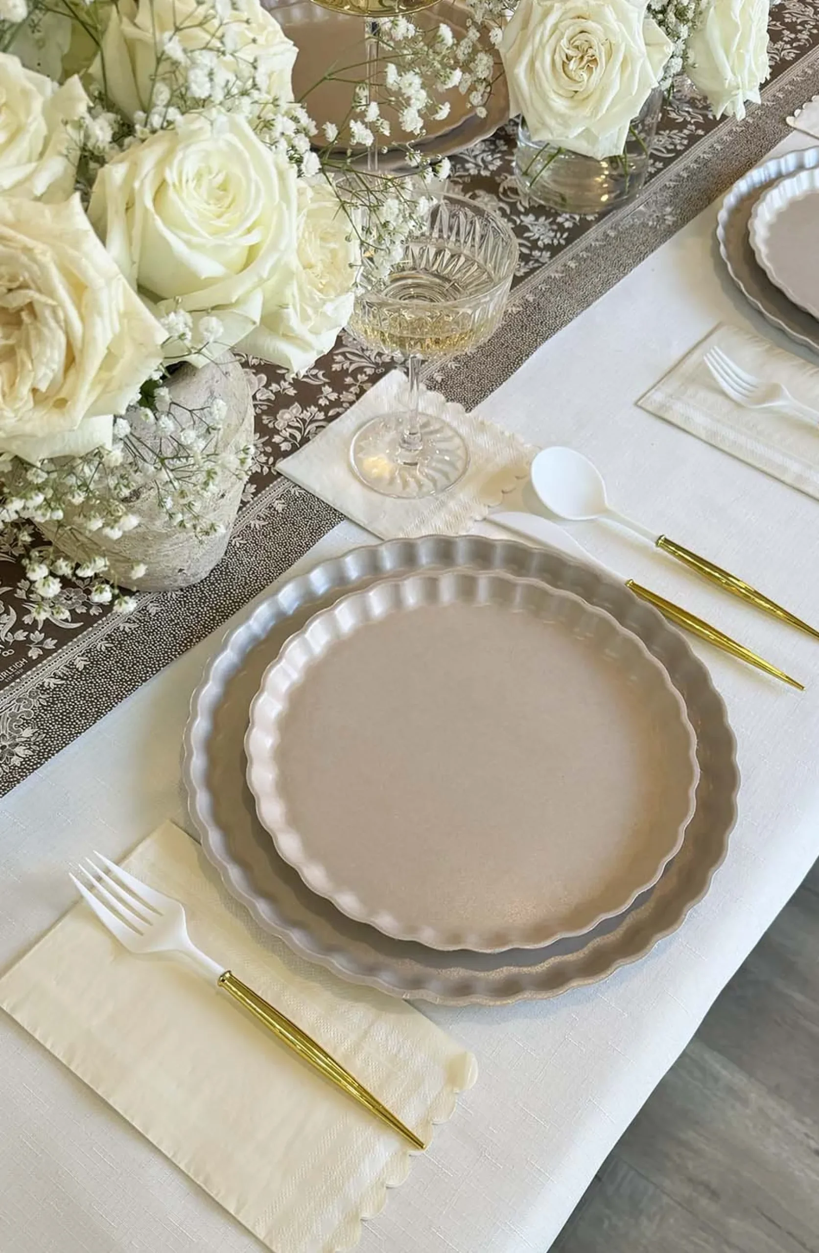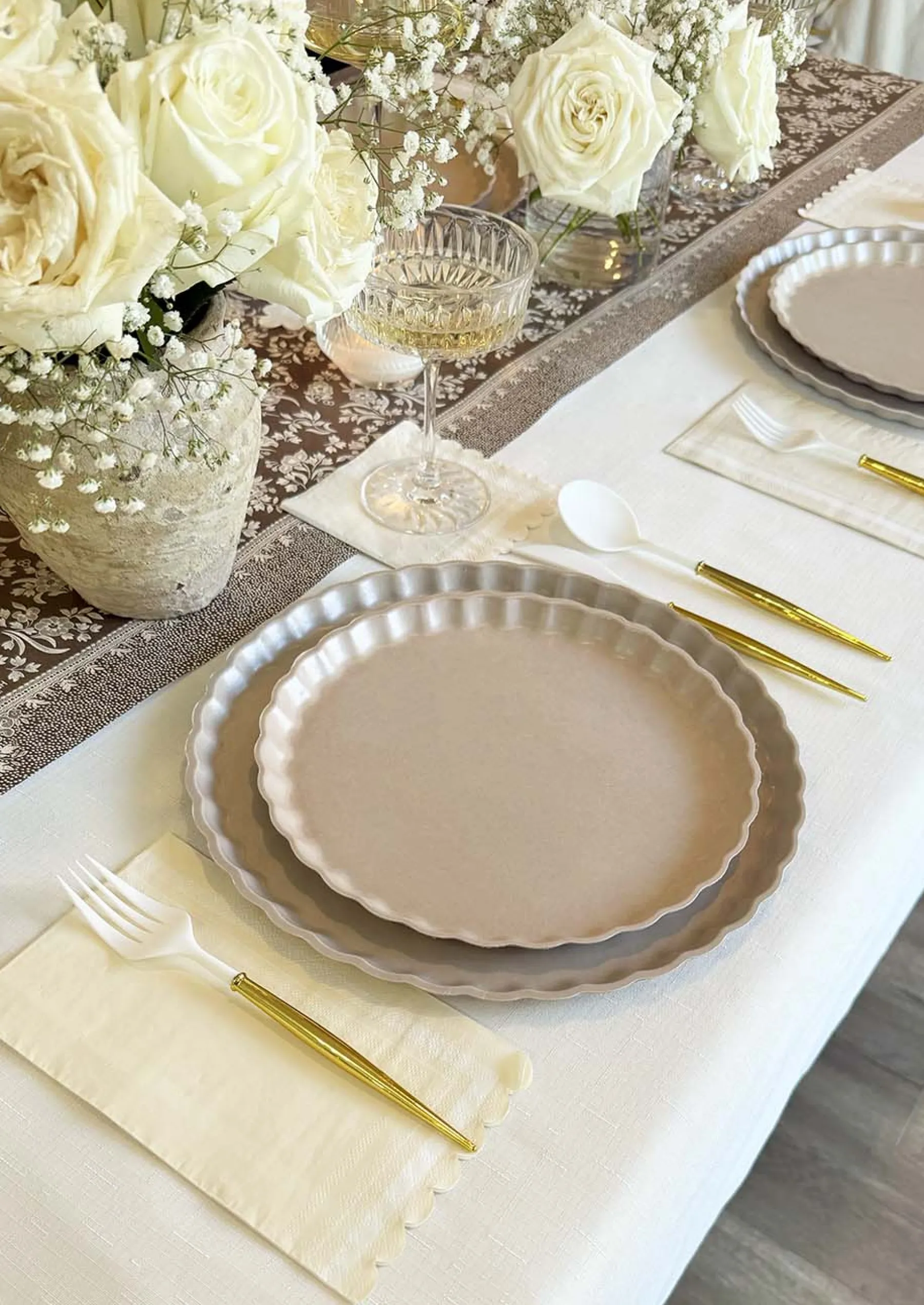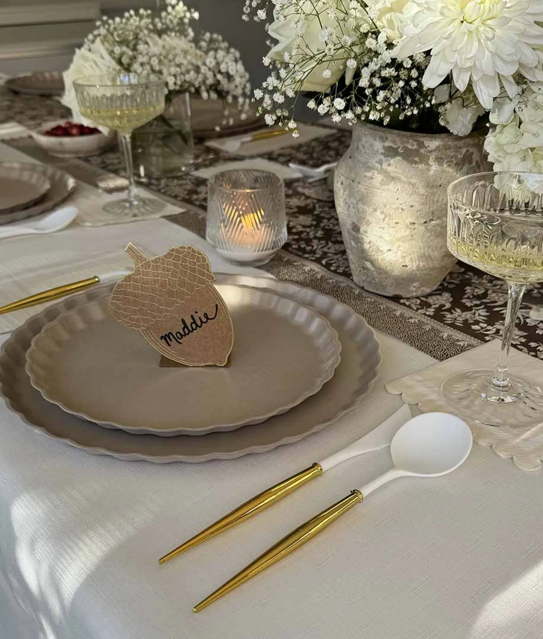 Elevate your holiday table into a professional tablescape. These sand colored plates are made of natural and biodegradable bamboo fiber making them incredibly sturdy and heavy-duty. Coupled with their beautiful scalloped edges, these high quality plates are unlike any other disposable plates you’ve encountered before. Your guests will not believe this Instagrammable set up is disposable and Earth friendly! Make entertaining easy & Instagrammable. A curated party-in-a-box, with everything you need to effortlessly create a professional, disposable, tablescape.