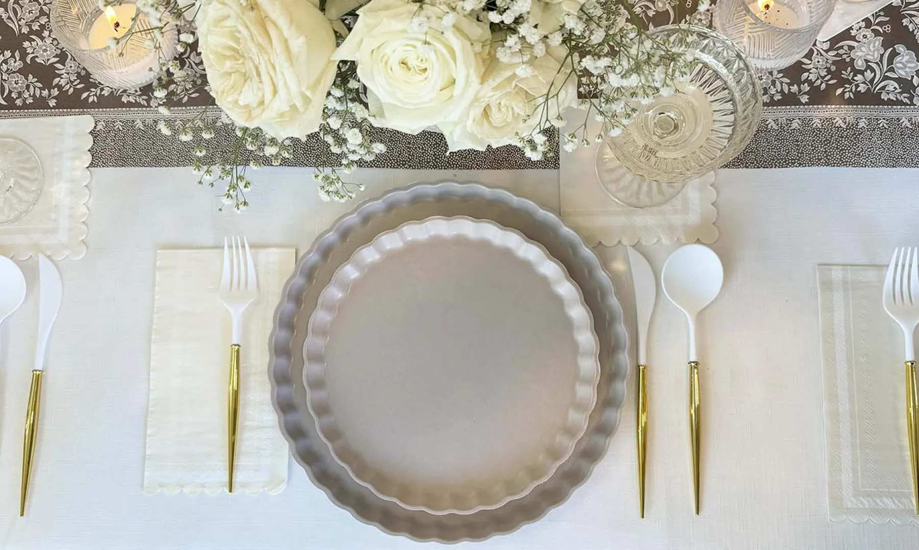 Luxe For Less: Elaborate tablescapes don’t have to be expensive! Skip the overpriced china without sacrificing style. Our designer disposable plates will save you time and money.