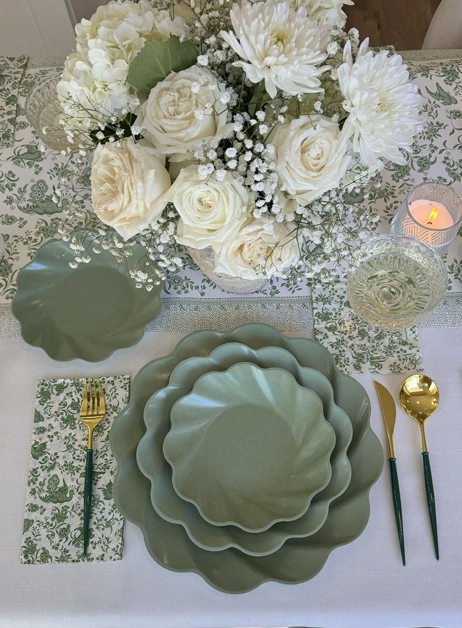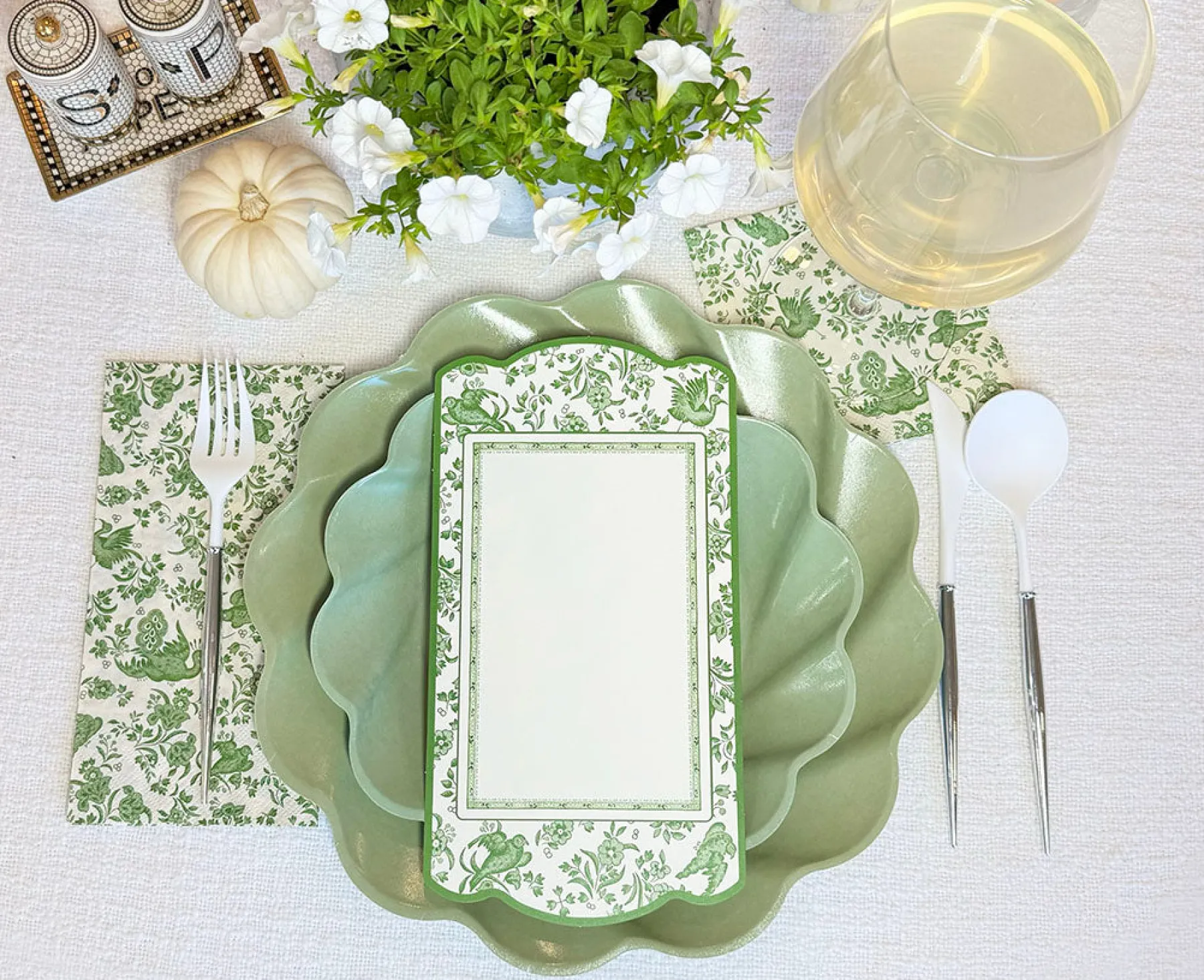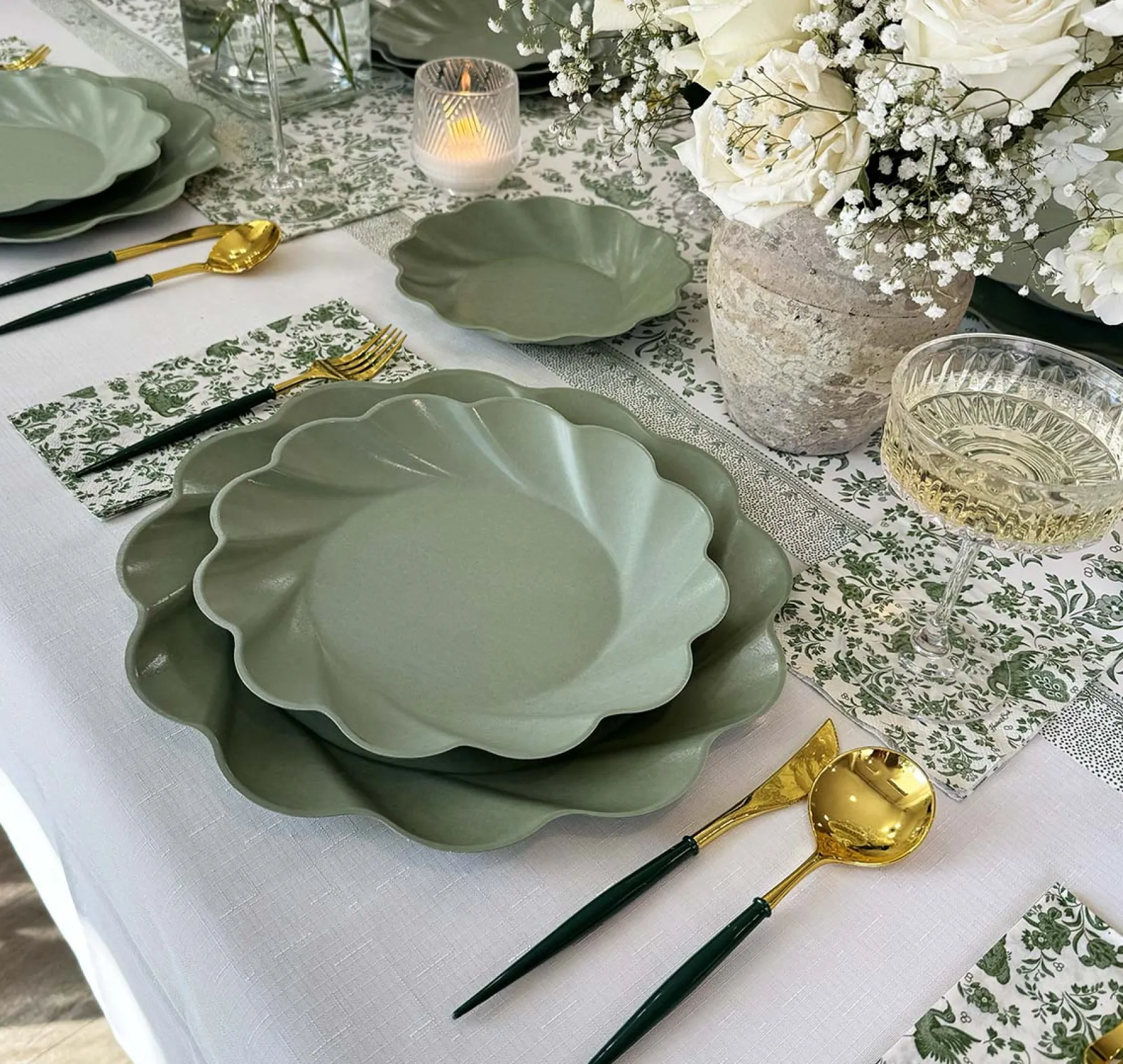 Elevate your holiday table into a professional tablescape. These sage colored plates are made of natural and biodegradable bamboo fiber making them incredibly sturdy and heavy-duty. Coupled with their beautiful scalloped edges, these high quality plates are unlike any other disposable plates you’ve encountered before. Your guests will not believe this Instagrammable set up is disposable and Earth friendly! A curated party-in-a-box, with everything you need to effortlessly create a professional, disposable, tablescape.