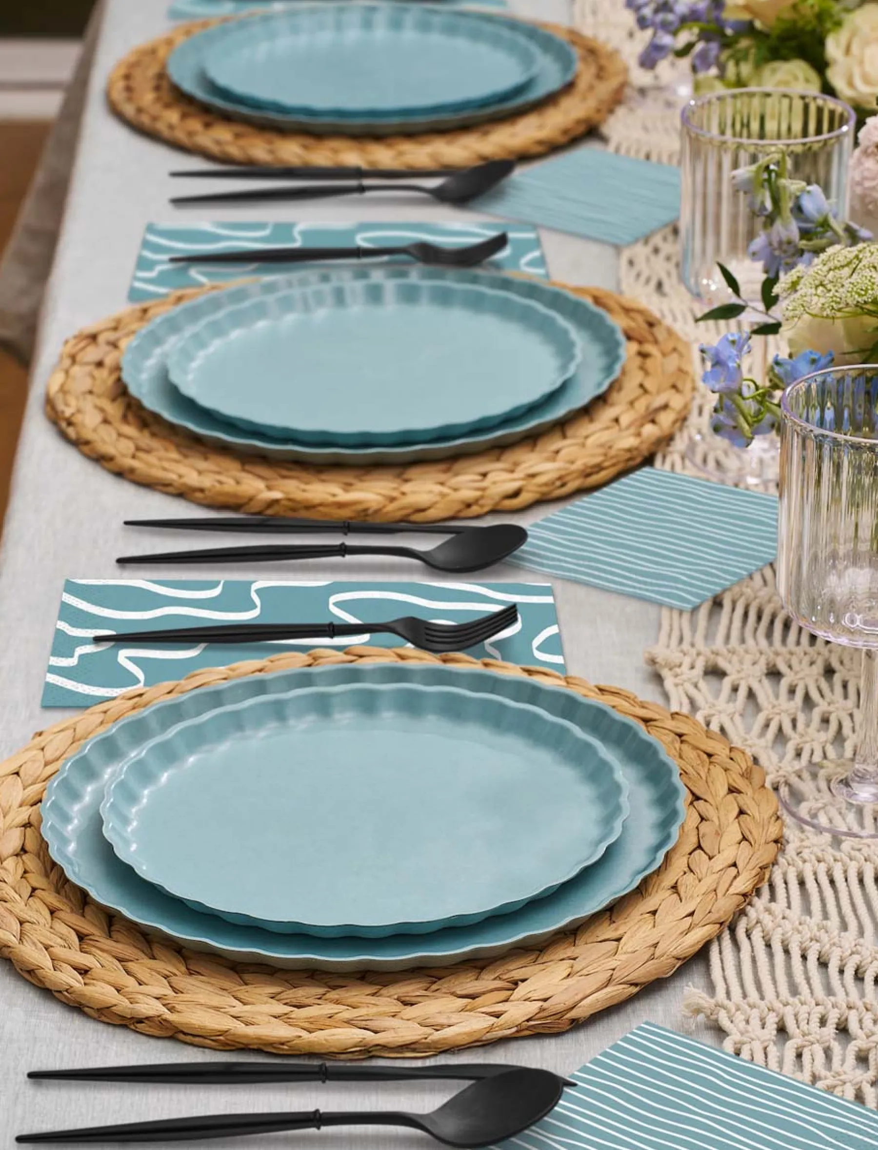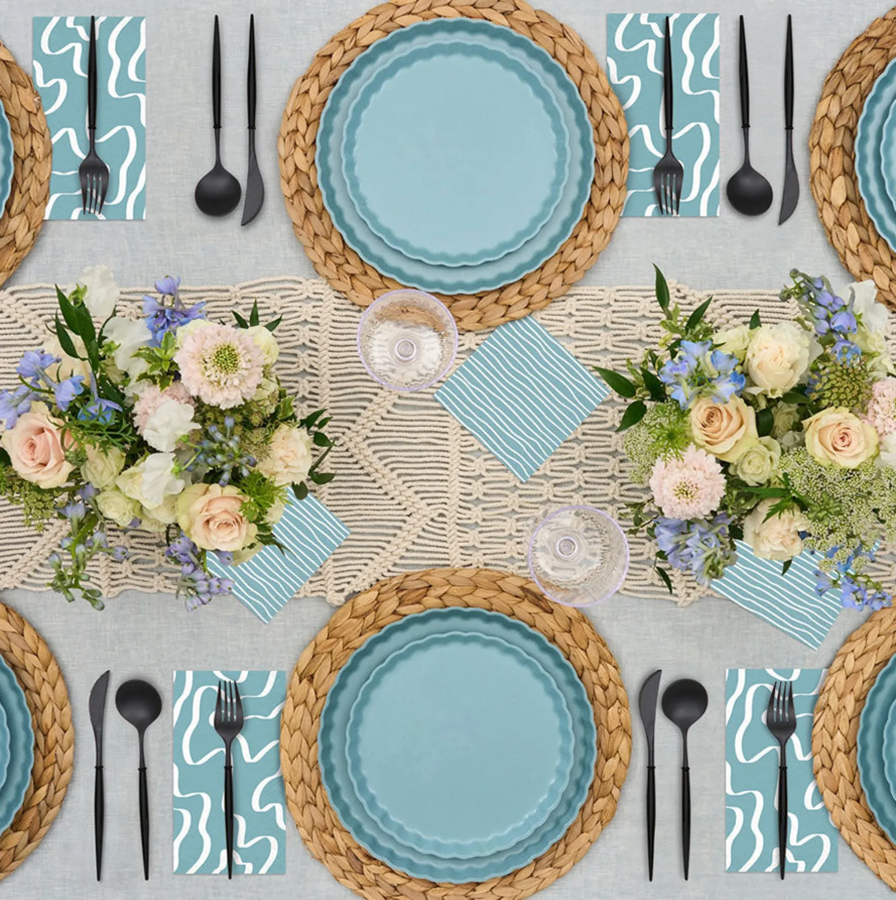 Sustainable meets sophisticated in our beautiful new line of eco-friendly & compostable tableware! These beautiful pool blue plates are made of natural and biodegradable bamboo fiber making them incredibly sturdy and heavy-duty. Coupled with their beautiful scalloped edges, these high quality plates are unlike any other disposable plates you’ve encountered before. Paired with fun and modern beige and white paper napkins and reusable cutlery, you have a table that is not only eco-friendly, but looks like a professional tablescape! Your guests will not believe this Instagrammable set up is disposable and Earth friendly.