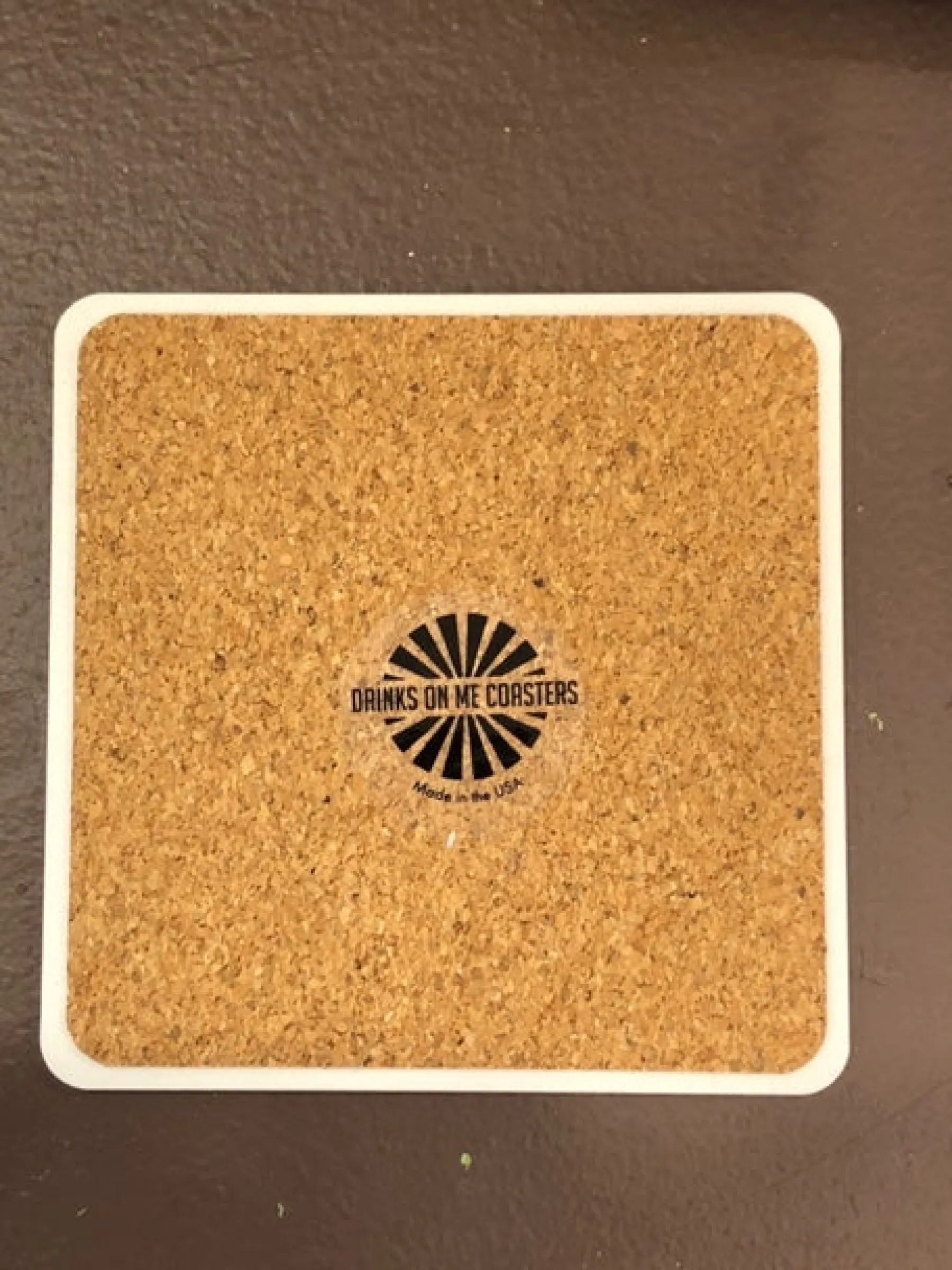 Coasters are 4″x4″ and made with resin with a cork backing and round corners.