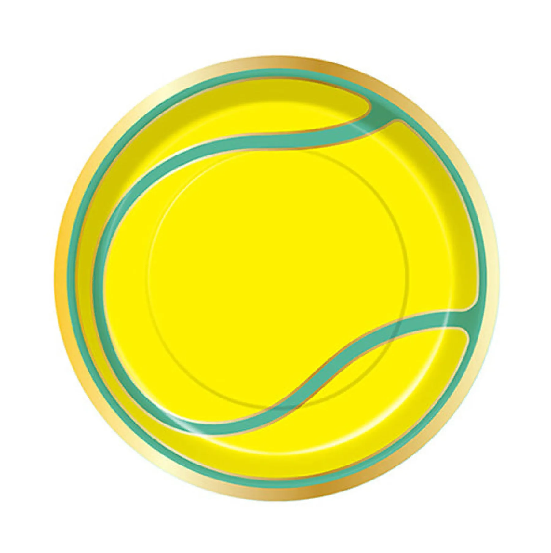 Designed in the shape of a classic tennis ball with vibrant detailing and complemented by a sleek metallic trim, these plates bring a fun yet sophisticated touch to your table. Both durable and disposable, they allow you to skip the dirty dishes without sacrificing quality and style. Your guests will never believe they’re disposable!
