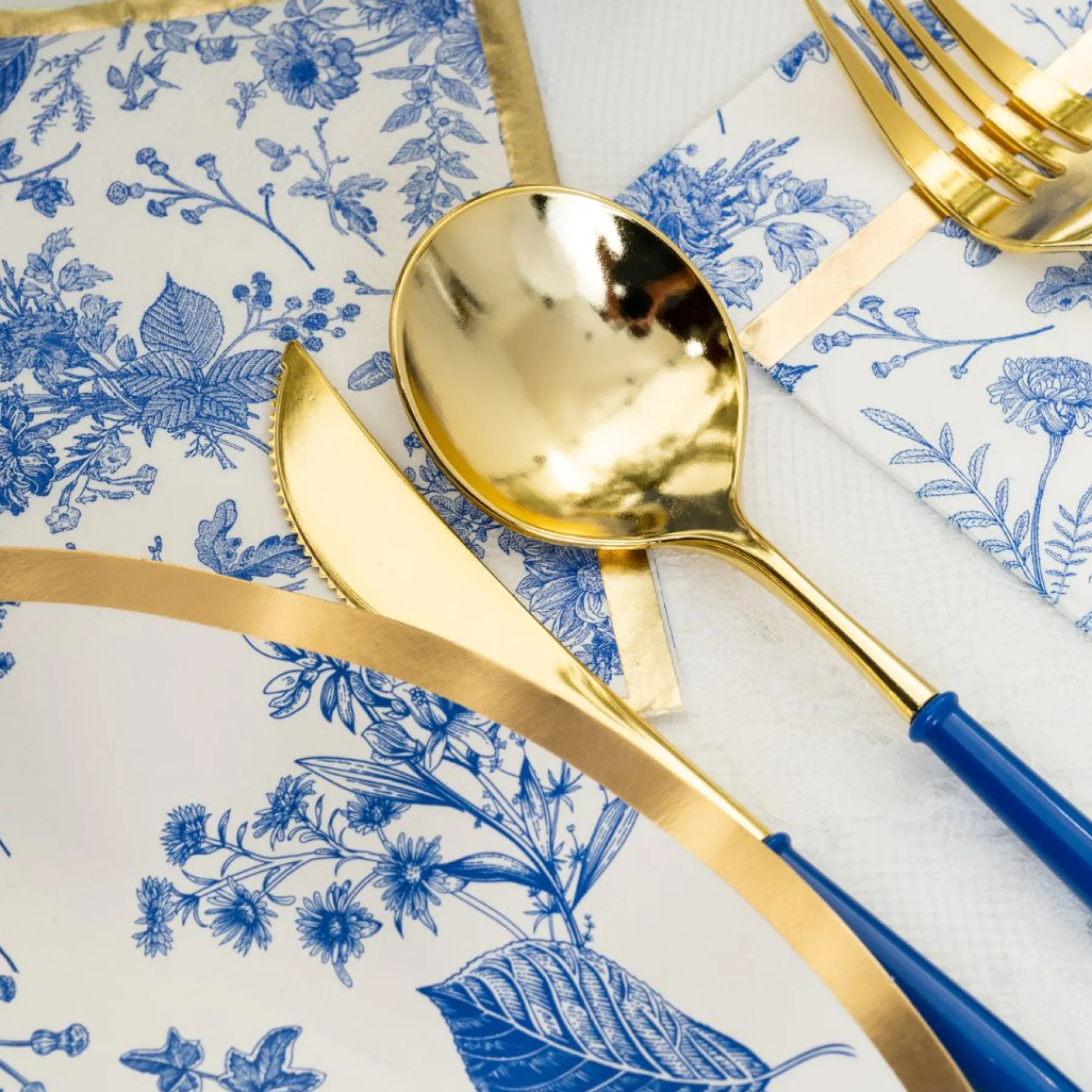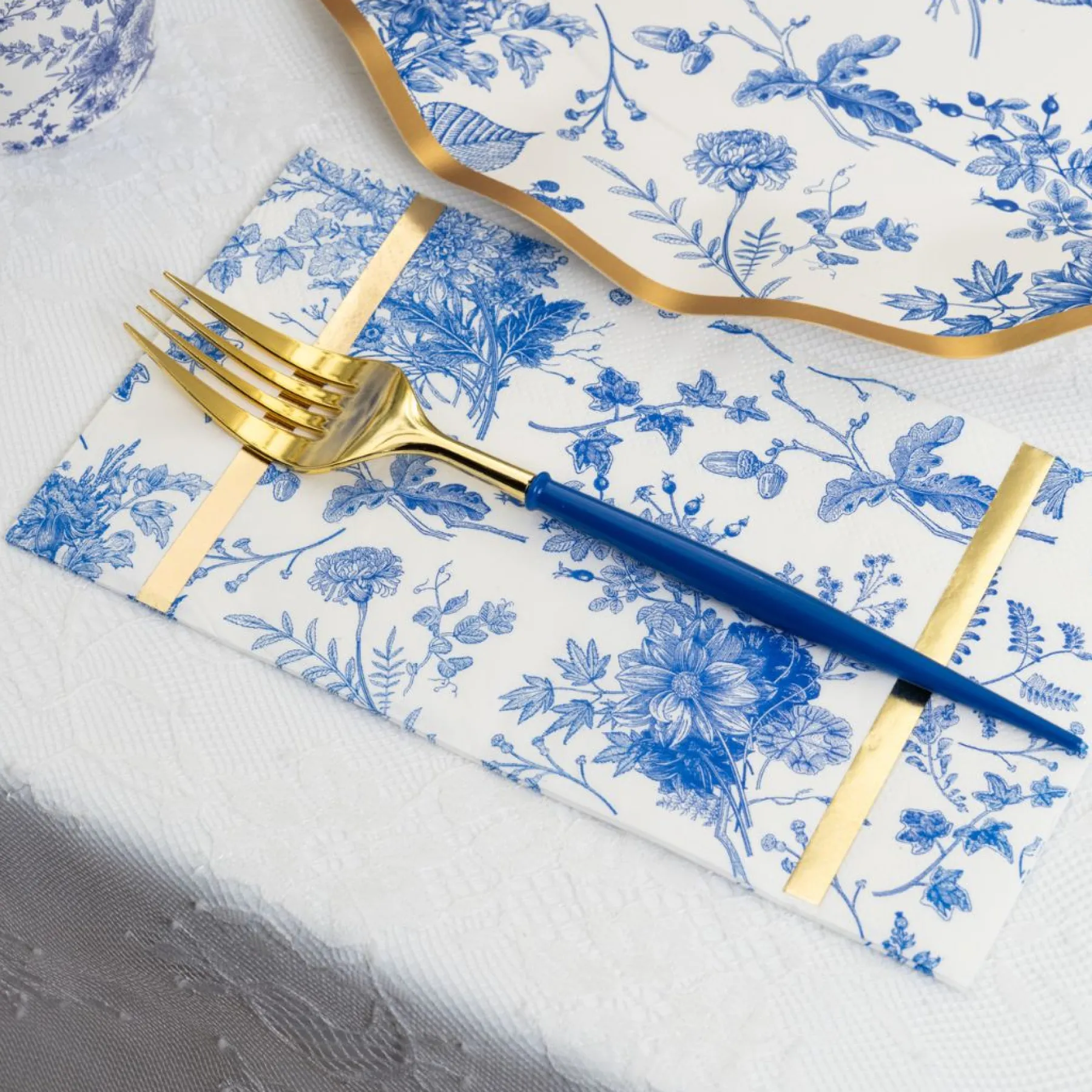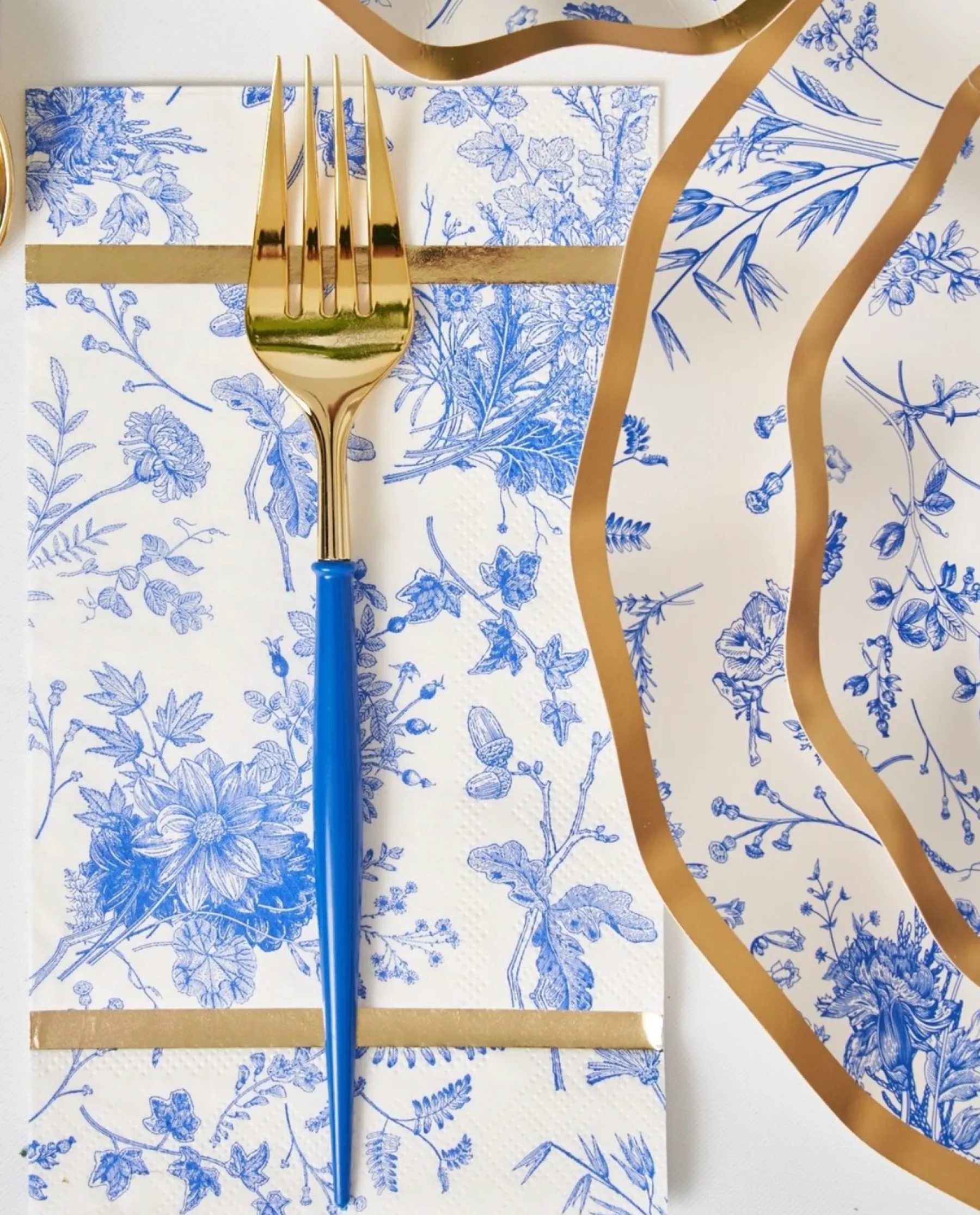 These white napkins with blue flowery images also have metallic gold coloring, they really add a touch of elegance to any table setting. These Timeless pieces are good year round.