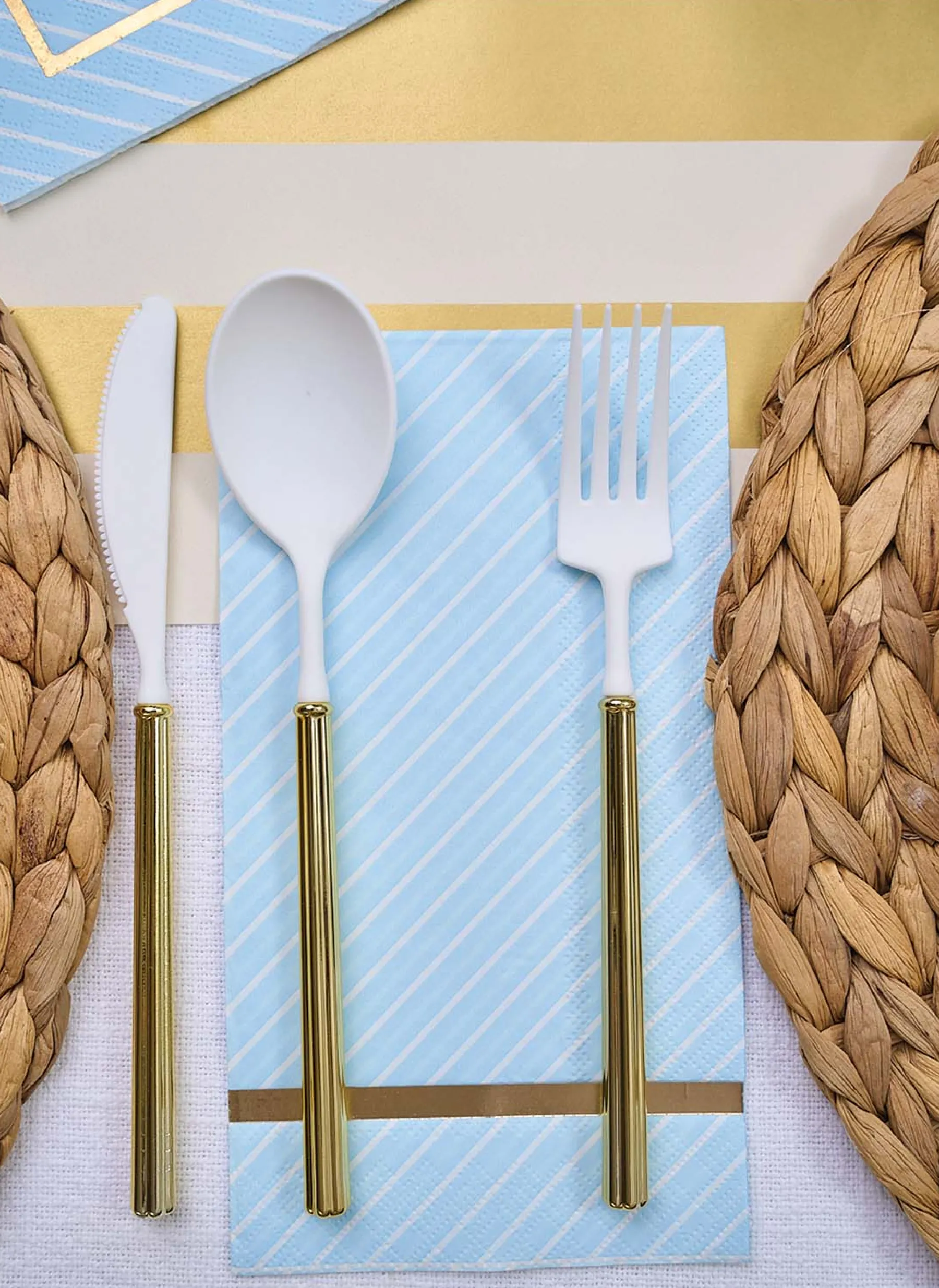 The Villa line of disposable plastic cutlery by Sophistiplate is a gorgeous and sleek modern design that elevates any table, place setting, or event. Perfect for Birthday Parties, Date Nights, Family Gatherings, Holidays, Parties, BBQs, Outdoor Entertaining, Kids Parties, and more.