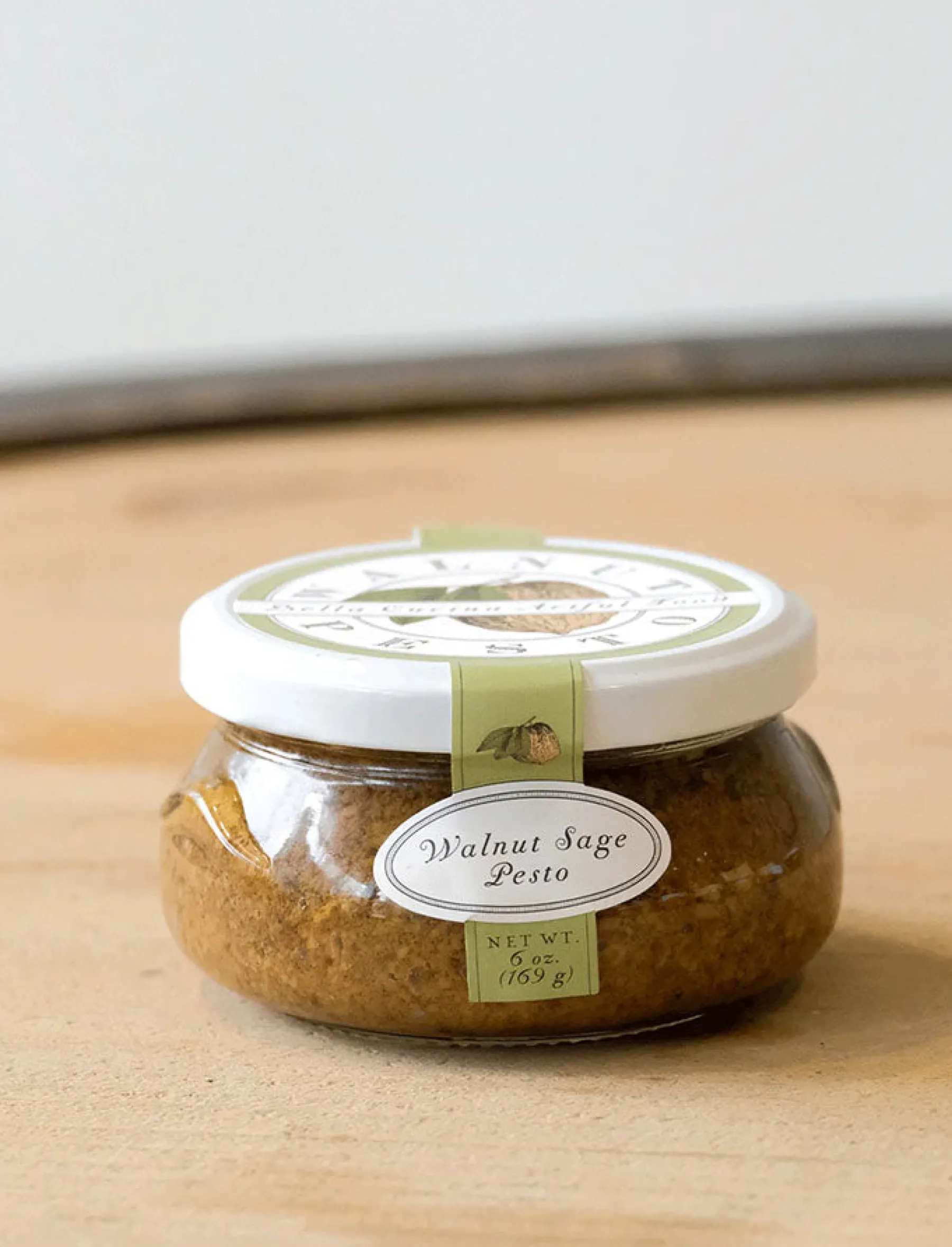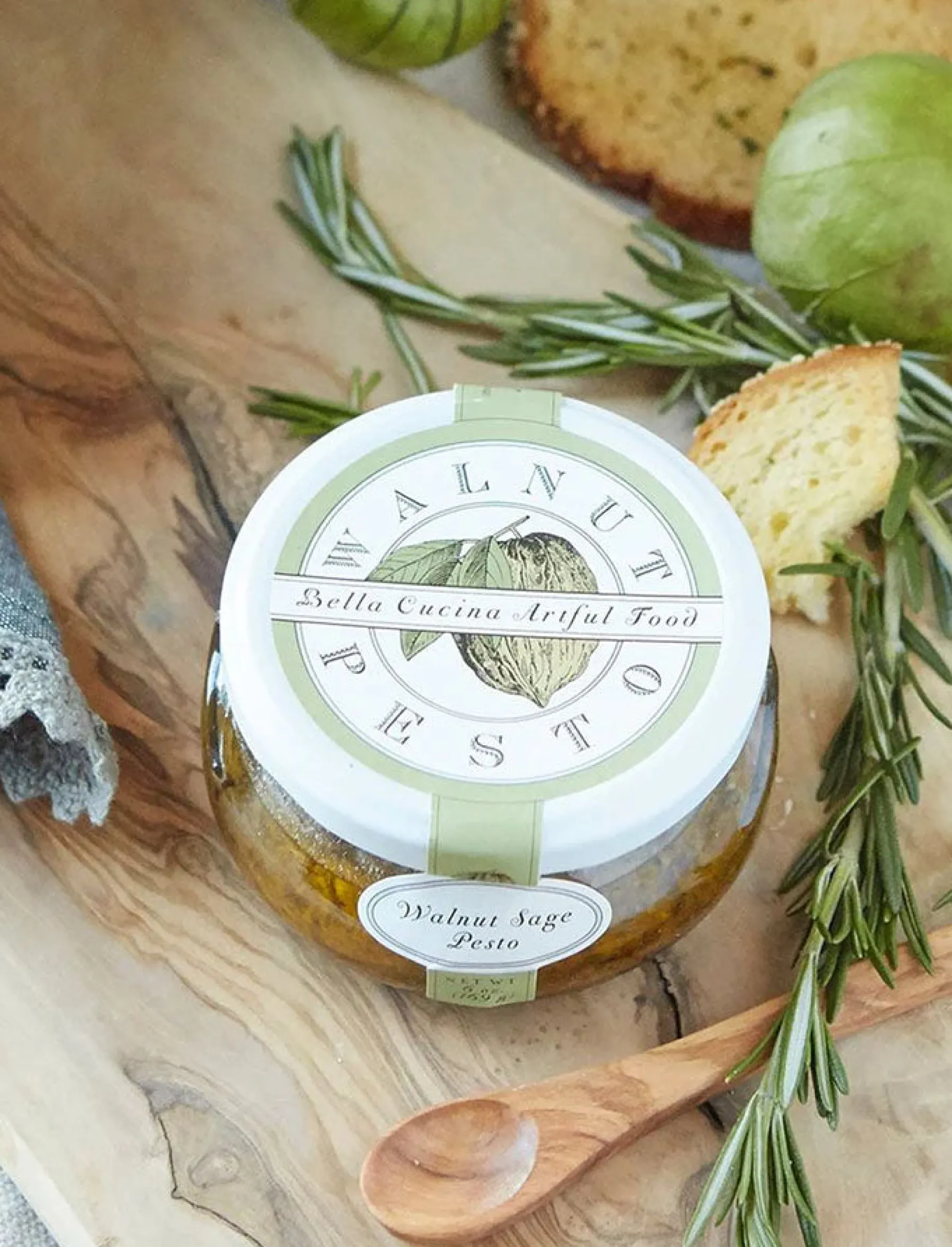 The Bella Cucina Walnut Sage Pesto is a rich and aromatic favorite, crafted with the perfect balance of toasted walnuts and sautéed garden-fresh sage leaves. The blend of extra virgin olive oil and expeller-pressed canola oil creates a smooth, velvety base, while Parmesan cheese adds a savory depth. Fresh parsley and garlic bring brightness, and a dash of vinegar enhances the flavor profile. This pesto, infused with fragrant herbs and spices, elevates cream sauces for pasta or meat dishes, making it a versatile and flavorful addition to any of our boards.